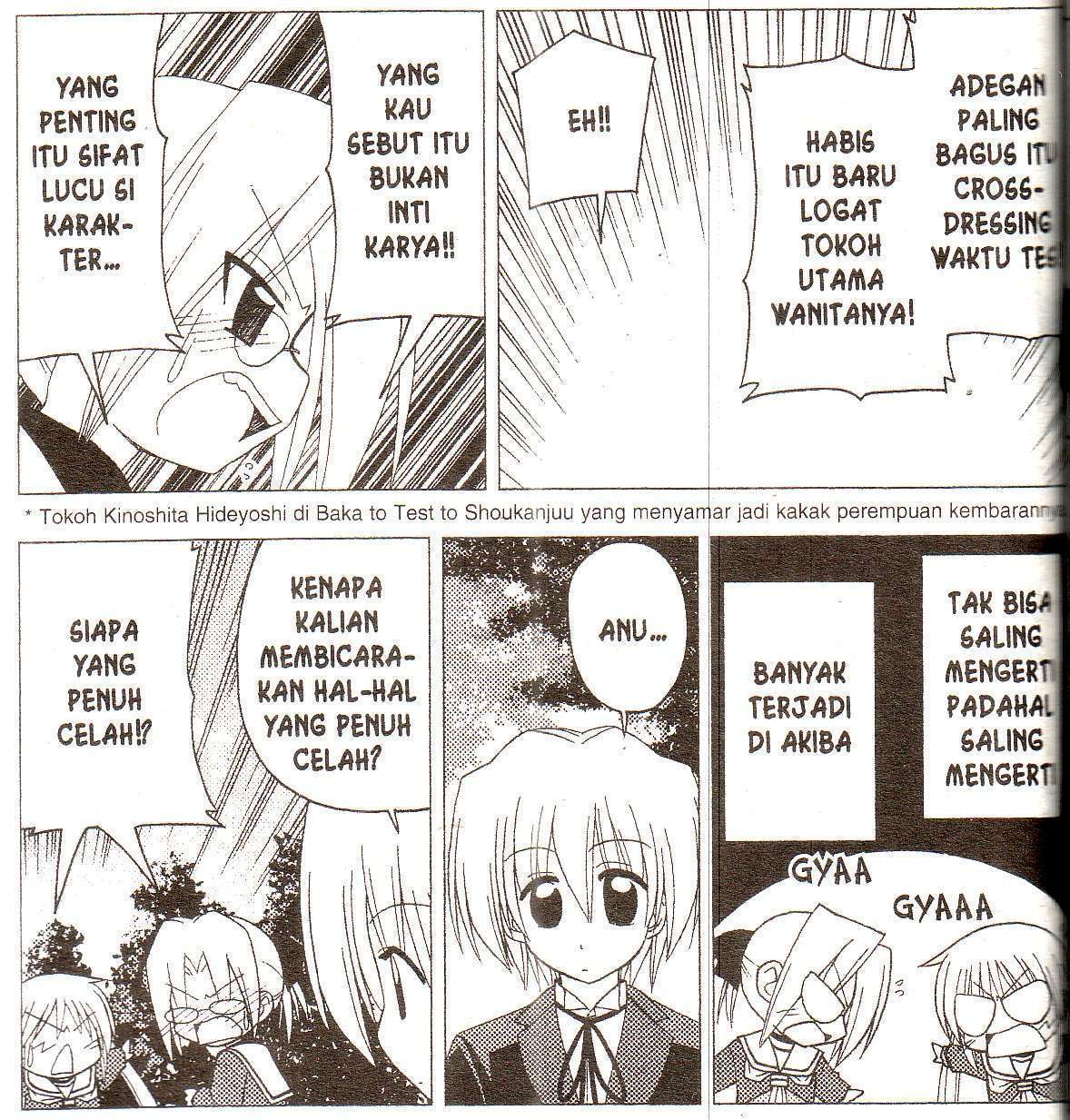 But one thing that may be overlooked is how even the same anime can be enjoyed by different people for different reasons. An anime, after all, can mix various elements that attract more than one type of viewers. Such situation is well-illustrated in chapter 192 of Hayate the Combat Butler, when Nagi and Chiharu were initially elated to find that they both like the same light novel series, but then ended up bickering when they turned out to value different aspects of the series, with the narration noting that they “can’t understand each other even though they understand each other.”