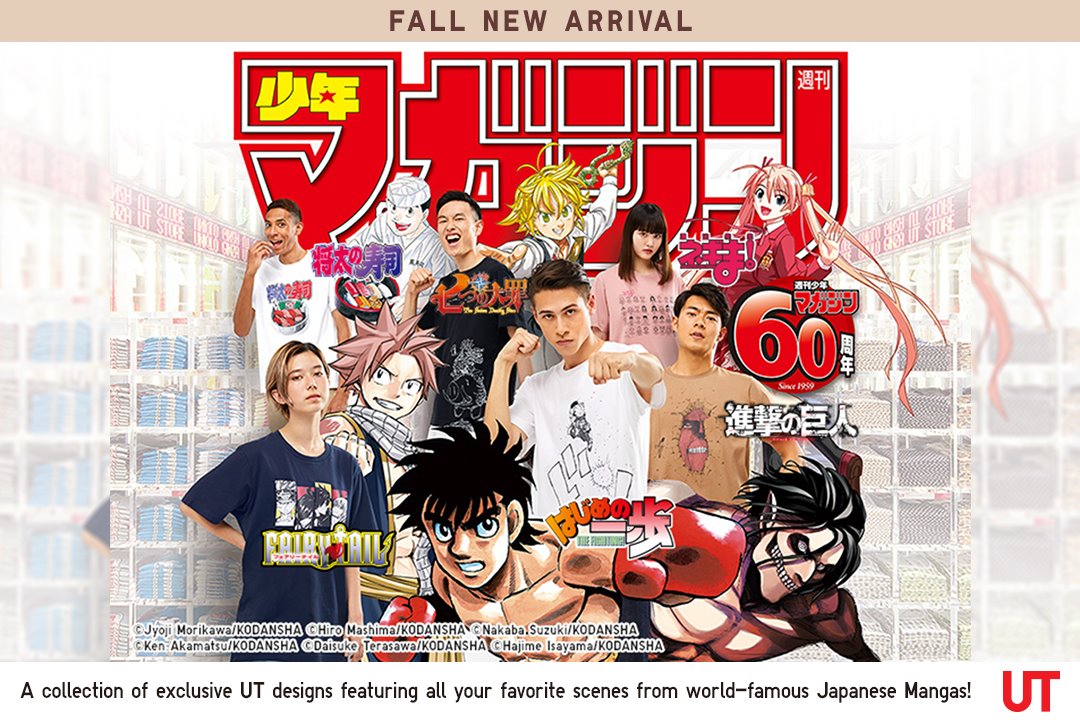 To celebrate the 60th anniversary of Weekly Shonen Magazine, Japanese casual wear designer, manufacturer, and retailer, Uniqlo, released their latest line-up of Manga UT Shirts featuring scenes and characters from the magazine in their stores in Indonesia. The collection includes the series Shota no Sushi, The Seven Deadly Sins, Negima! Magister Negi Magi, Fairy Tail, Hajime no Ippo, and Attack on Titan, which are available for men since August 21, 2019.