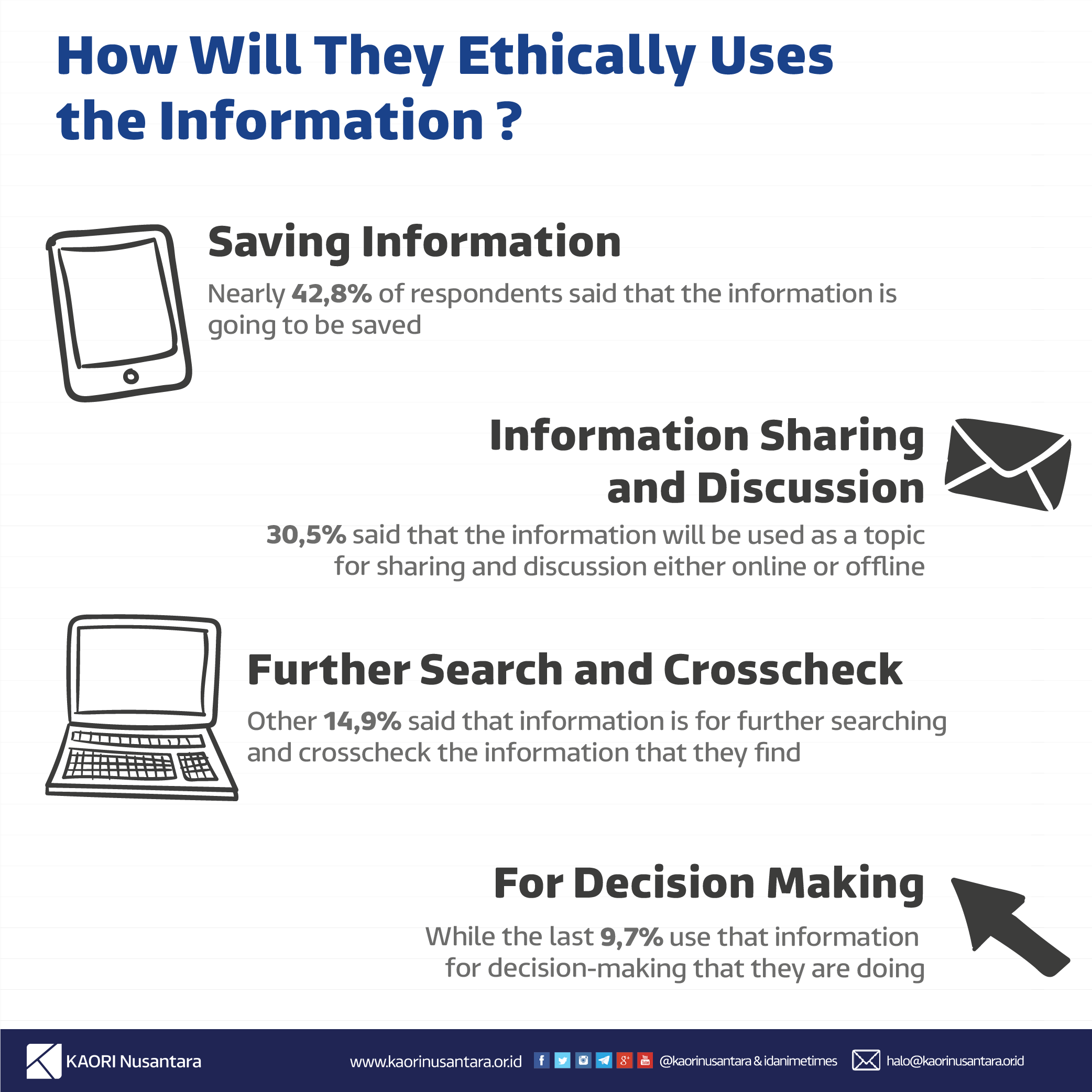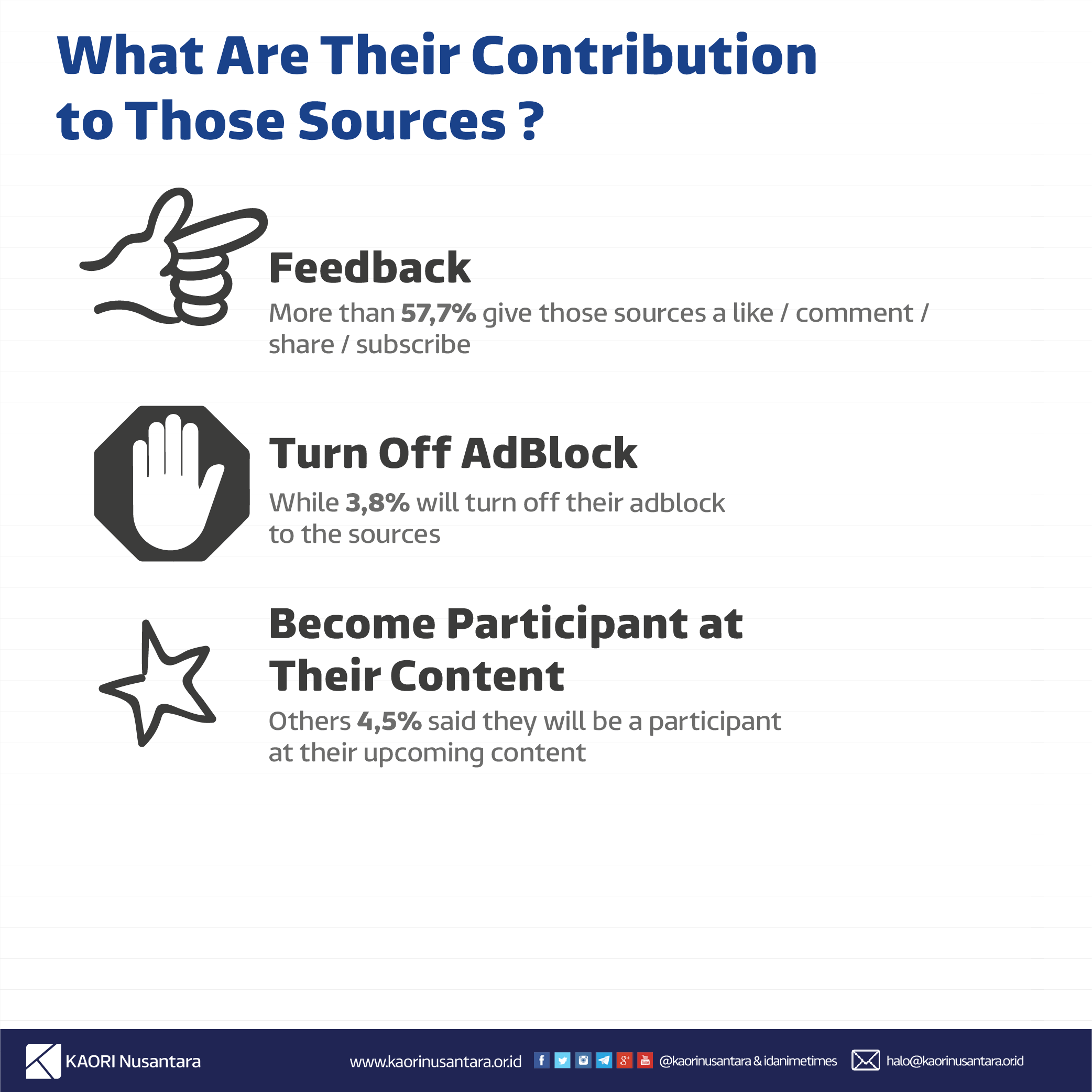 We also asked their contribution to information sources. Most of them agree to contribute to the page of information sources by giving some feedback such as like, comment, share, and subscribe. But there are also respondents who don’t give any contribution to their information resources.