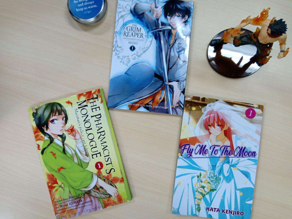 On Friday (20/12), the Twitter account of Elex Media Komputindo’s Editor of Comics has posted a picture of new manga titles that are scheduled to be released in the week of December 23, 2019. The manga included in the picture are the first volume of Kenjiro Hata’s Tonikaku Cawaii, which will be published with the title Fly Me to the Moon, Irono’s The Grim Reaper and the Argent Cavalier, and Minoji Kurata’s adaptation of Natsu Hyuuga’s light novel The Pharmacist’s Monologue.