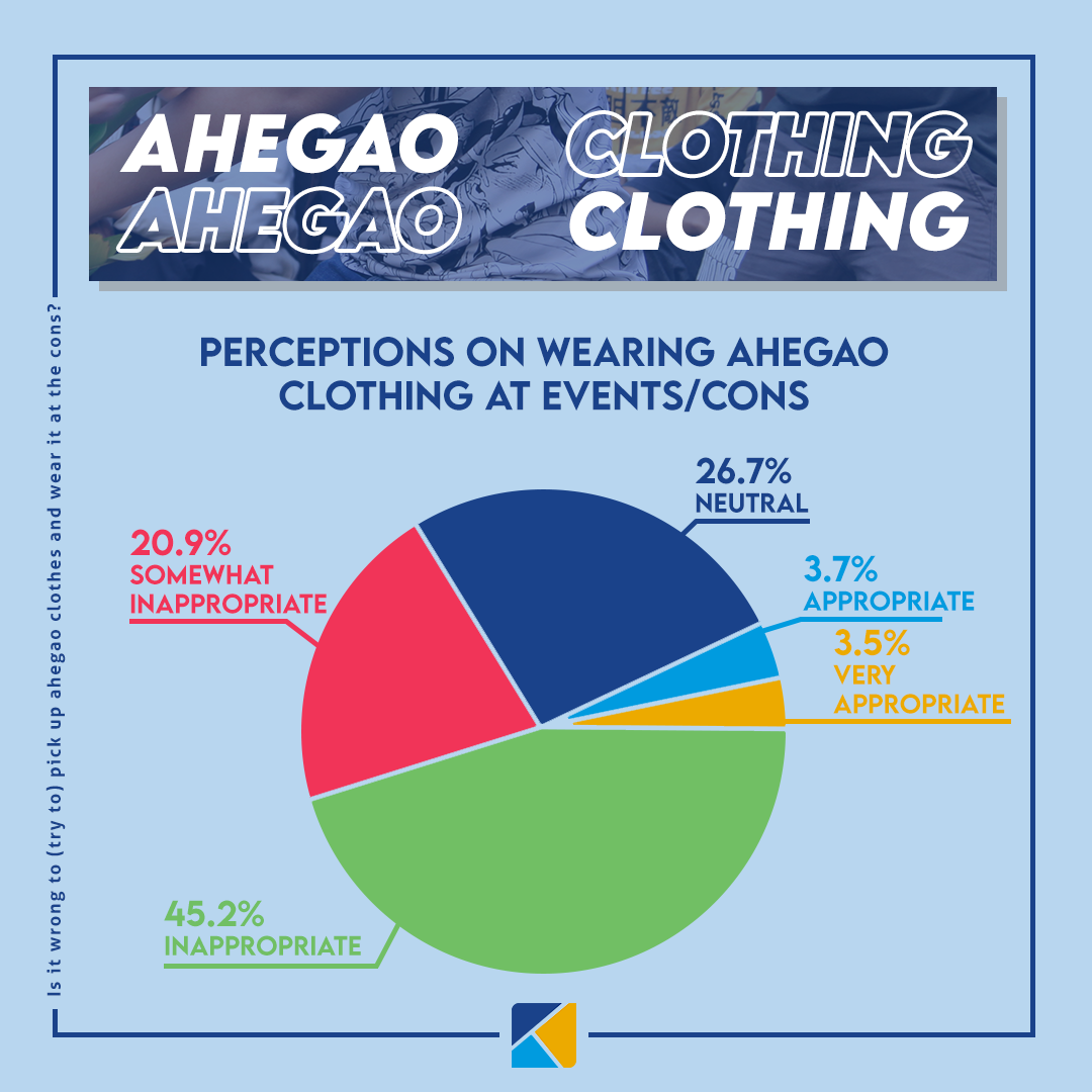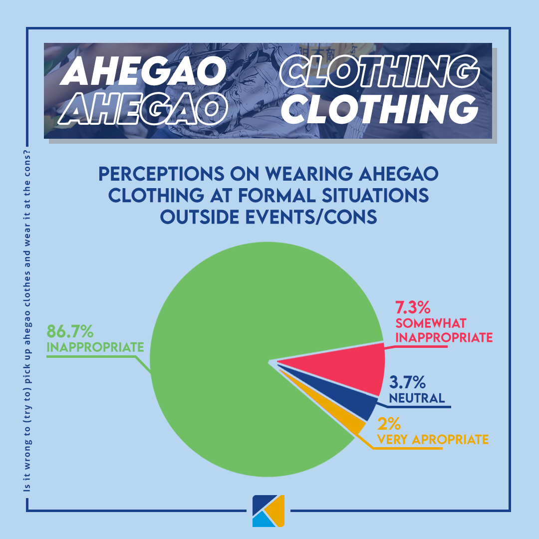 As for formal situations, since they tend to have their own specific rules regarding what could/should or couldn’t/shouldn’t be worn, so the majority opinion is that those rules are to be followed, as they are not spaces meant to be for people to show the hobbies they are interested in. This is actually not much different from opinions about wearing ordinary anime/manga-themed clothing in formal situations, the difference is that that the proportion of strongly negative perceptions compared to mildly negative ones are higher when it comes to ahegao clothing than regular anime/manga-themed clothing.