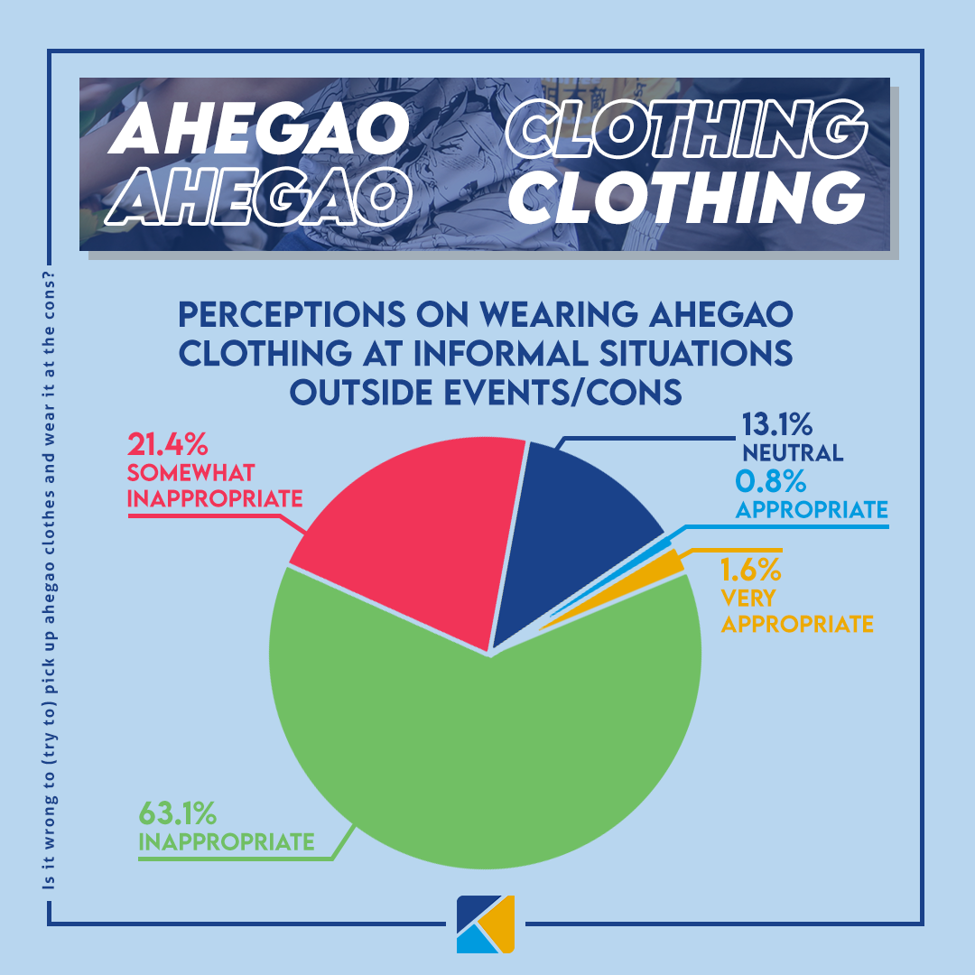 Specific among the respondents who own ahegao clothing themselves, 26 out of 55 feel neutral to the use of the clothing at events/cons, and 19 others regard it very appropriate, while only 4 feel it’s actually somewhat or very inappropriate. Among the owners of ahegao clothing, wearing the clothing is said to allow them to be identified as a consumer of hentai materials by other fans of similar interests, which would then lead to sharing recommendations between them. In this sense, the clothing still has the same social function as regular anime/manga-themed shirts to identify fans who share similar specific interests.