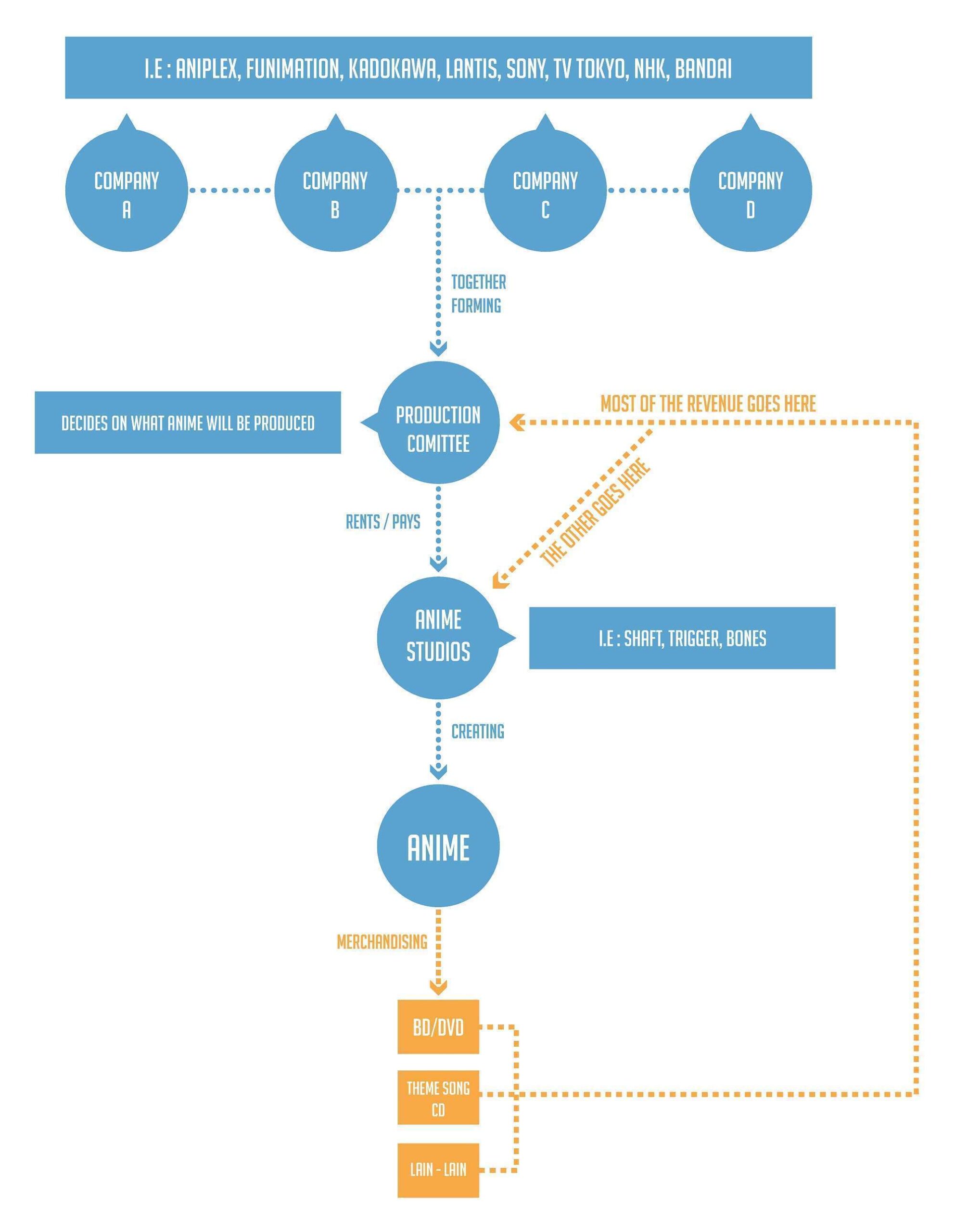 The figure above is a simple illustration of the hierarchical structure in anime production process. You can see that animation studio is funded or hired by the production committee (制作委員会/seisaku iinkai).