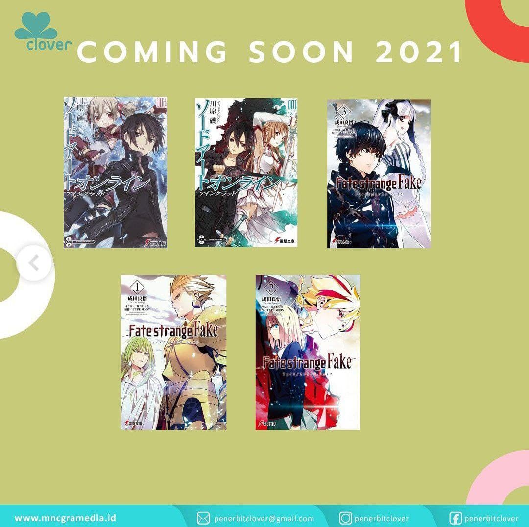 m&c!‘s novel imprint, Clover, has announced a slate of new novels to be published in Indonesia in 2021. The Instagram post made on Monday (28/12) includes two light novel series; Reki Kawahara’s Sword Art Online and Ryohgo Narita’s Fate/strange Fake. The second picture in the post shows the first two volumes of Sword Art Online and the first three volumes of Fate/strange Fake. There is still no further information regarding the release date, and it is also noted that this is not an exhaustive list of all the novels that will be released by Clover in 2021.