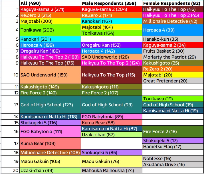 As the above chart shows, there are some titles that rank high among the female voters like Hanako-kun, Fruits Basket, or Moriarty the Patriot, but do not get into the top 20 list of the combined votes. On the other hand, there are titles that are very popular among the male voters like Rent-A-Girlfriend (Kanokari) or Oregairu that do not get many votes from the female participants. By detailing the top choices of the participants of different genders, we could at least get some hints on where the interests of male and female participants differ or similar. It is not perfect, but these details hopefully can lead to a more critical assessment of the result rather than just presenting the heavily biased overall top list.