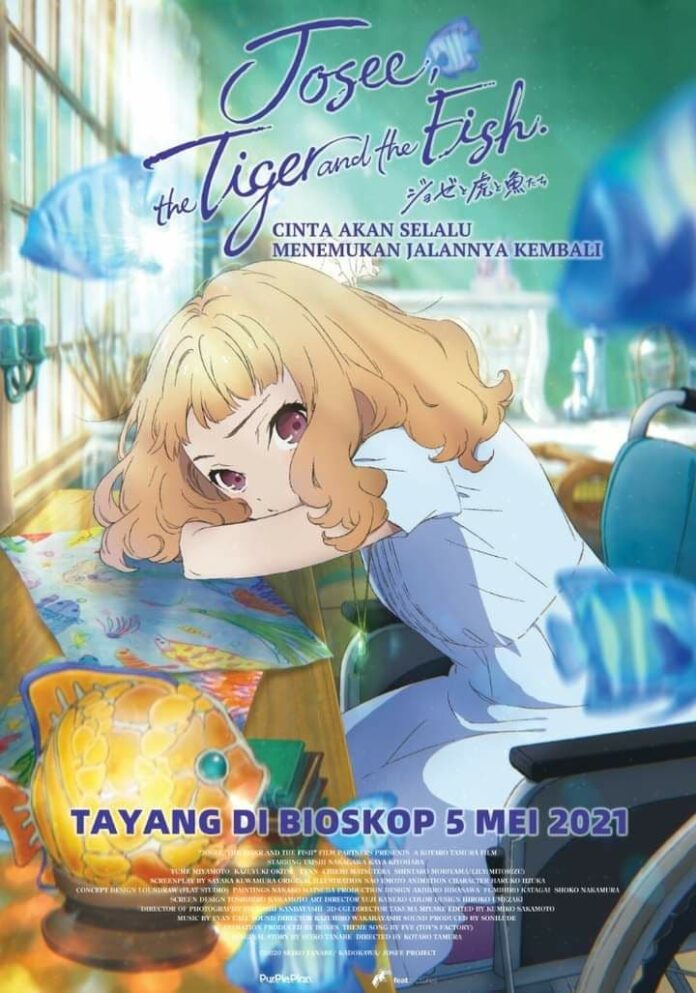 As reported previously, the anime film Josee, the Tiger and the Fish will be screened in Indonesia in 2021. Two cinema chains, CGV Cinemas Indonesia and Cinépolis Indonesia has then announced in mid-April that the film will be screened on their cinemas starting from 5 May 2021. An Indonesian poster of the film has also been revealed along with the announcements.