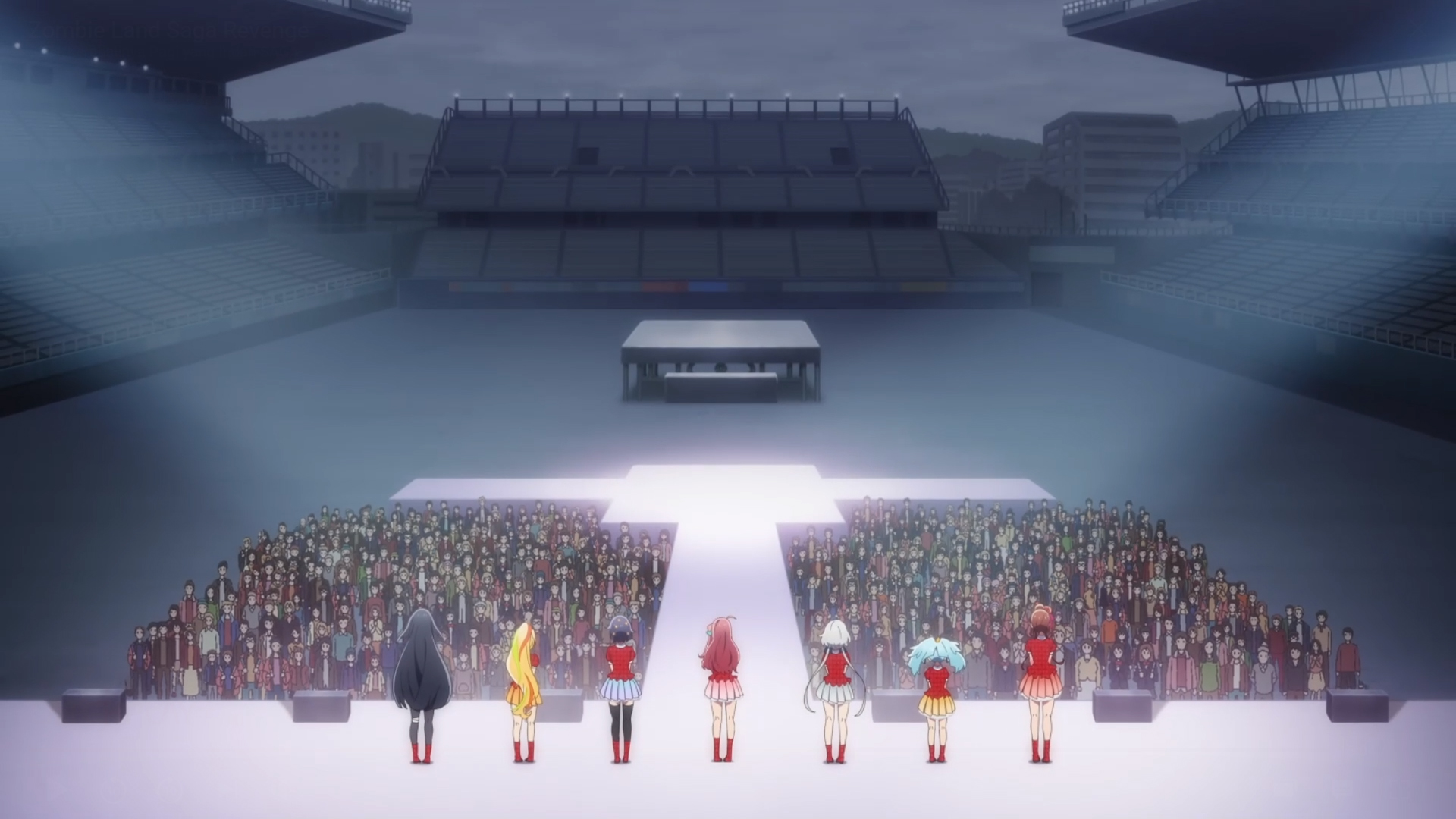 After their triumphant live performance at Arpino, it looks like Franchouchou’s success can’t be stopped—that is, until their following performance at the Ekimae Fudōsan Stadium bombs and leaves them in massive debt. With their producer Kotaro in a slump and the girls having to make their way up from rock bottom again, will Franchouchou have their “revenge” and finally be able to “save” Saga?