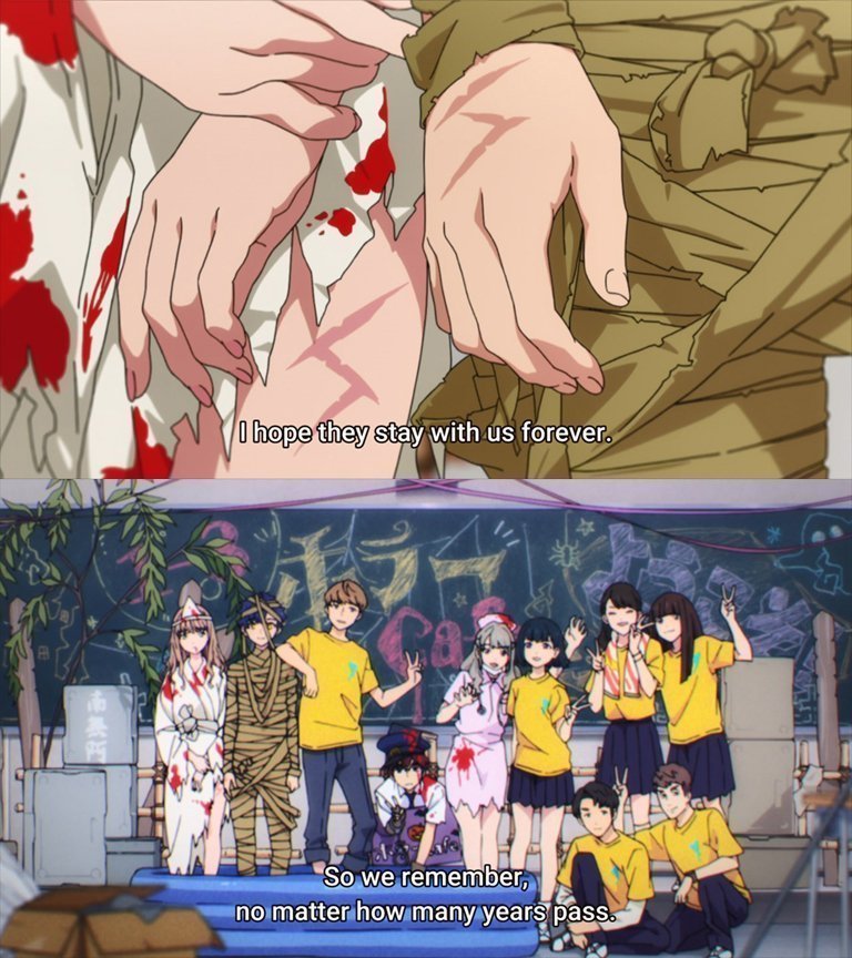 I think it’s perfect that the show ends with a school festival, (something that happens in a dreary place like school, but is fun and maybe isn’t so bad to have) with our characters slowly coming out of their shells to reach out to those around them, finding fulfilment from it. Yomogi becomes more outspoken in lending a hand to those who need it. Yume opens up to trust in others more. Koyomi finds the confidence to move forward with his life, as does Chise who becomes even more confident with her individuality. And Gauma manages to find what he couldn’t in his previous life: friends that are true.