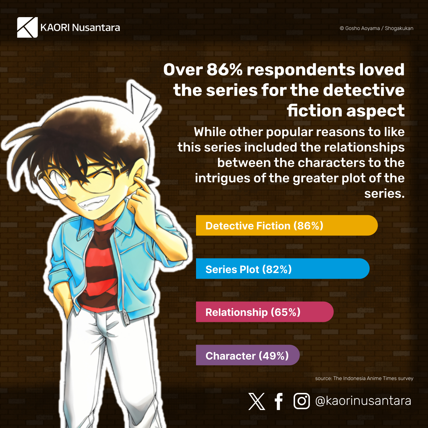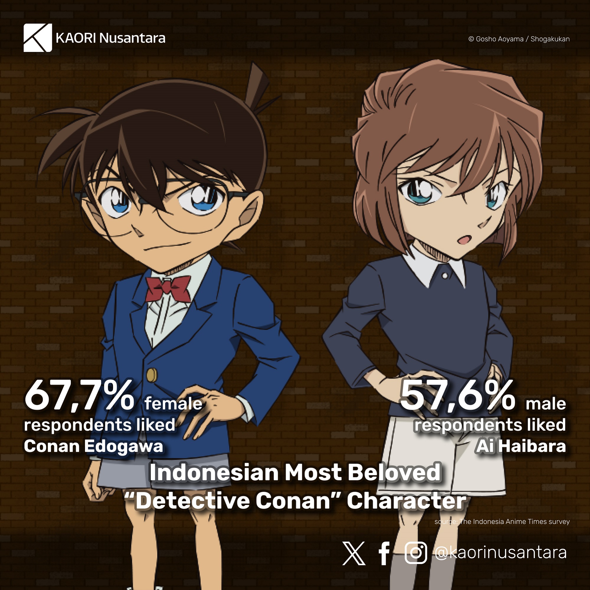Created by Gosho Aoyama, Detective Conan has been the longest-running manga series of Weekly Shonen Sunday magazine after more than 30 years of serialisation, and an anime series based on the manga has also been in production continuously since 1996. In Indonesia, Detective Conan has been one of the biggest shonen manga titles. The official Indonesian edition of the series has been available before the so-called “big three” titles of Weekly Shonen Jump (One Piece, Naruto, Bleach) had official Indonesian editions, and its sales rival those three or have even surpassed them at times.