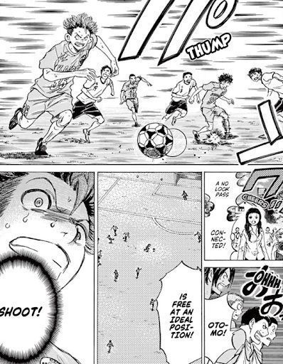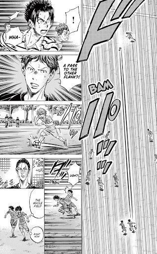 Luckily, his hard work pays off. When Aoi adapts to his new role, he becomes one of the team’s main attacking threats. It’s because Aoi is able to spot the space in the opponent’s defense and occupy it. From this panel, Aoi realizes that the opponents are moving toward Otomo and Yoshitsune and leaving a space in the middle. He moves to that space, creating a passing triangle with Otomo and Yoshitsune.
