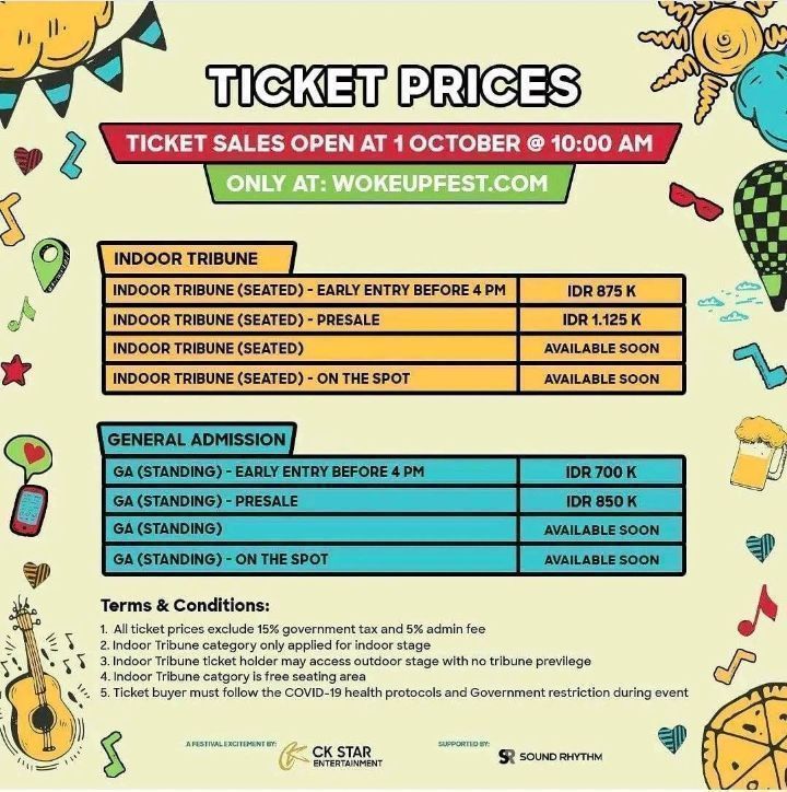 Woke Up Fest 2023 is slated to be held on 25 February 2023 at Istora Senayan, GBK Sports Complex, Jakarta. Pre-sale tickets can be purchased online starting from 1 October 2022. Prices start from RP. 700.000 for GA class tickets (standing) and Rp. 875.000 for indoor tickets (seating).