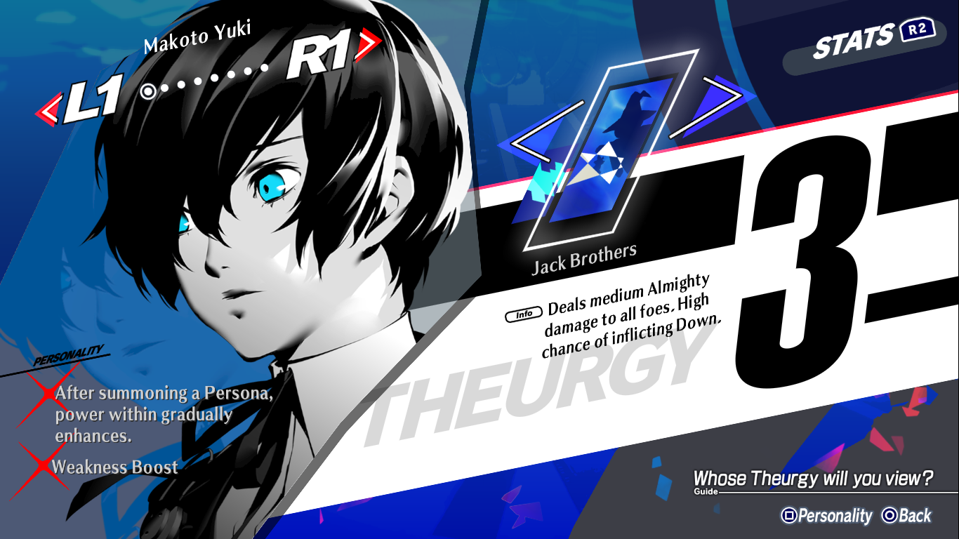 What I like about the Theurgy bar is that it charges faster if the character does specific actions that match their role in the party; for example, Mitsuru’s bar charges faster if she applies status ailments to enemies, Yukari’s charges faster if she uses healing skills, and Junpei’s charges faster if he hits a critical on his attacks. This allows each character’s personality to shine even inside the game’s combat system. Moreover, it incentivizes players to approach combat creatively. For the protagonist himself, the Theurgy system incorporates fusion spells that existed in the original game. The system incentivises players to fuse more personas so that they can unlock new fusion spells in the game.