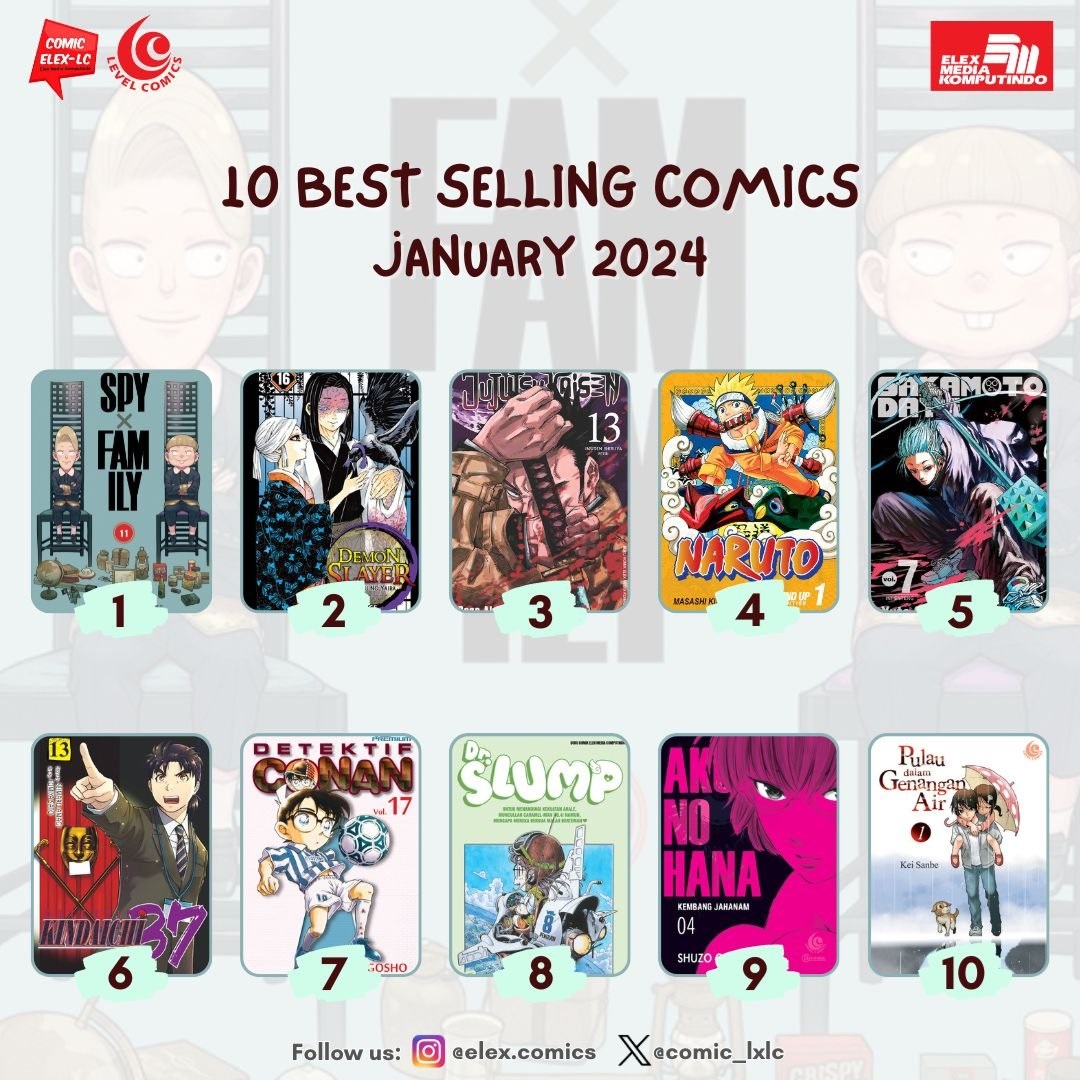 On Tuesday (6/12), Elex Media Komputindo posted a list of the publisher’s ten best-selling comics for January 2024. Spy x Family volume 11 takes first place, followed by Demon Slayer: Kimetsu no Yaiba volume 16 and Jujutsu Kaisen volume 13 in second and third place.