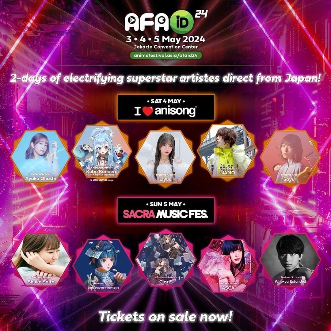 Kobo Kanaeru, Sayuri, Ayaka Ohashi, Liyuu, and nano will be presented in the AFAID 2024 I ❤️ Anisong concert on Saturday, 4 May 2024. ClariS, Sangatsu no Phantasia, ASCA, Shuka Saito, and Who-ya Extended will be presented at the Sacra Music Fes which will be held on Sunday, 5 May 2024.