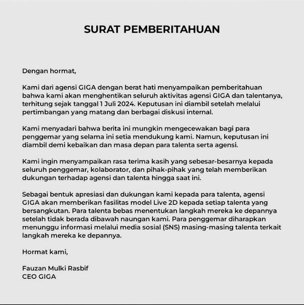 On Monday, 1 July 2024, GIGA Agency decided to cease their VTuber agency project. This announcement was made through GIGA’s social media account.