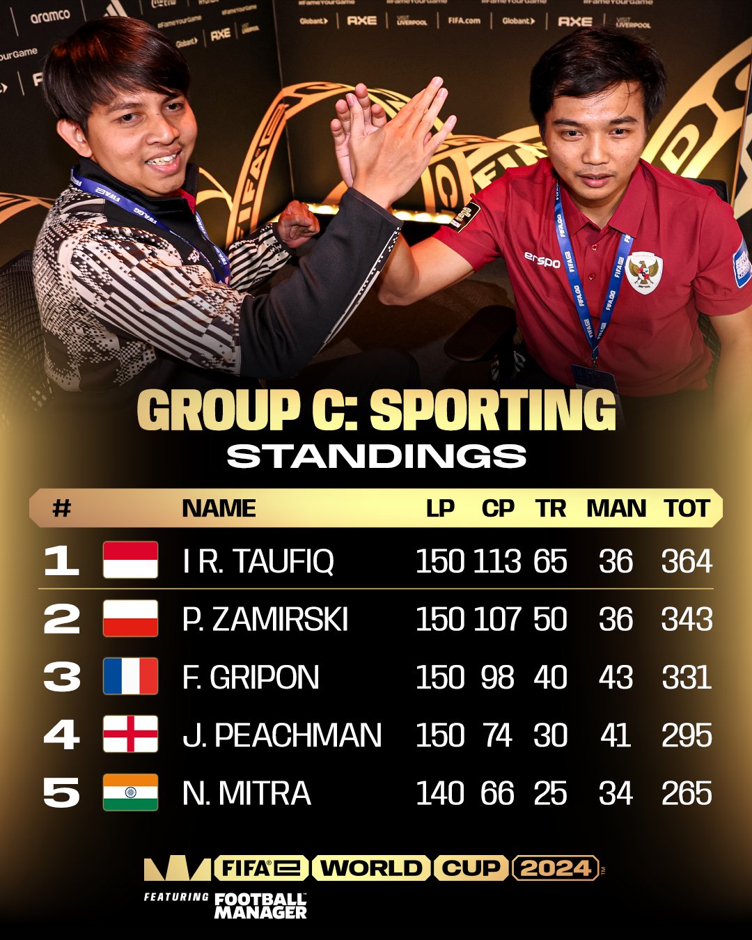During the three-day group stage, each team was tasked with managing Sporting CP in the Football Manager game, aiming to win both the regional league and the Champions League within one in-game season per day. Group C comprised teams from England 1 (the host nation, which fielded two teams), India, France, Poland, and Indonesia. Indonesia led the standings with a total of 364 points, achieving 107 points in the first season, 129 in the second, and 128 in the third. This impressive performance secured the Indonesian team’s advancement to the Final Four.