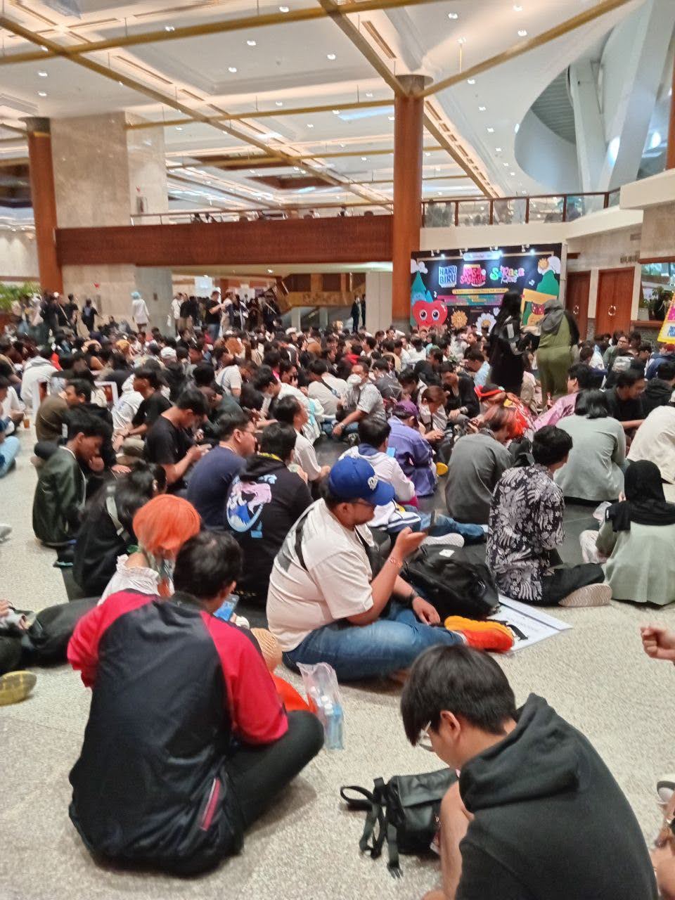 Before the event began, the atmosphere around the venue was very crowded. Fans from all over Indonesia, some even coming from abroad, waited patiently for the venue to open while wearing the attributes of their favourite Hololive VTubers. I met fellow Hololive fans whom I usually interacted with online. Some came from out of town, and there were even some fans who came from Comifuro 19, which happened to be held at the same time as the concert but held at ICE BSD, Tangerang, around 25 Km from Jakarta Convention Center.