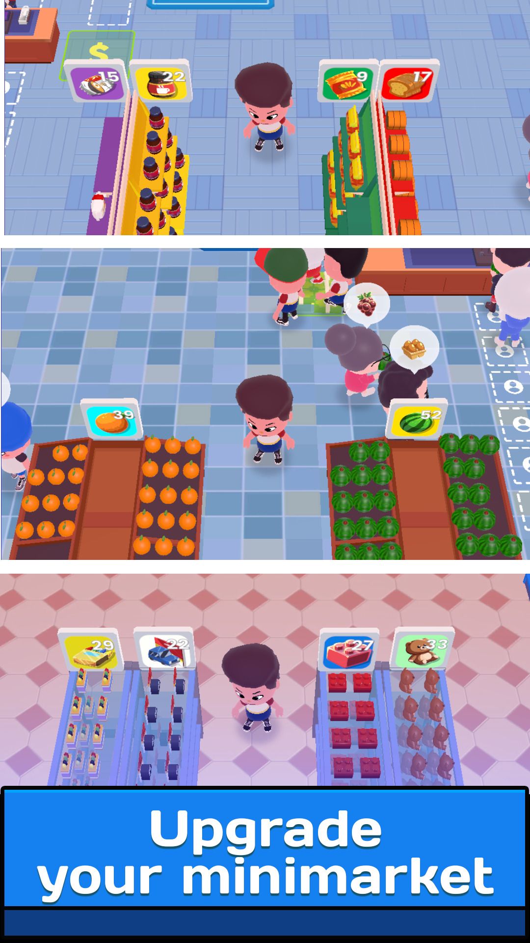 In this game, players step into the role of a minimarket owner. At the start of the game, the player’s shop only contains one type of item. However, by serving customers, players can collect money that can be used to increase the number of items, add shelves, and pay employees. As the player’s minimarket grows, the game will become more challenging because players must continue to monitor stock and employees, as well as increase customer satisfaction.