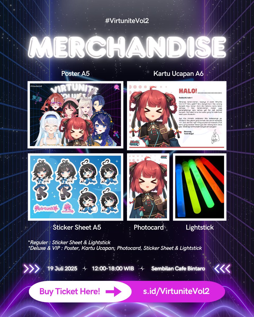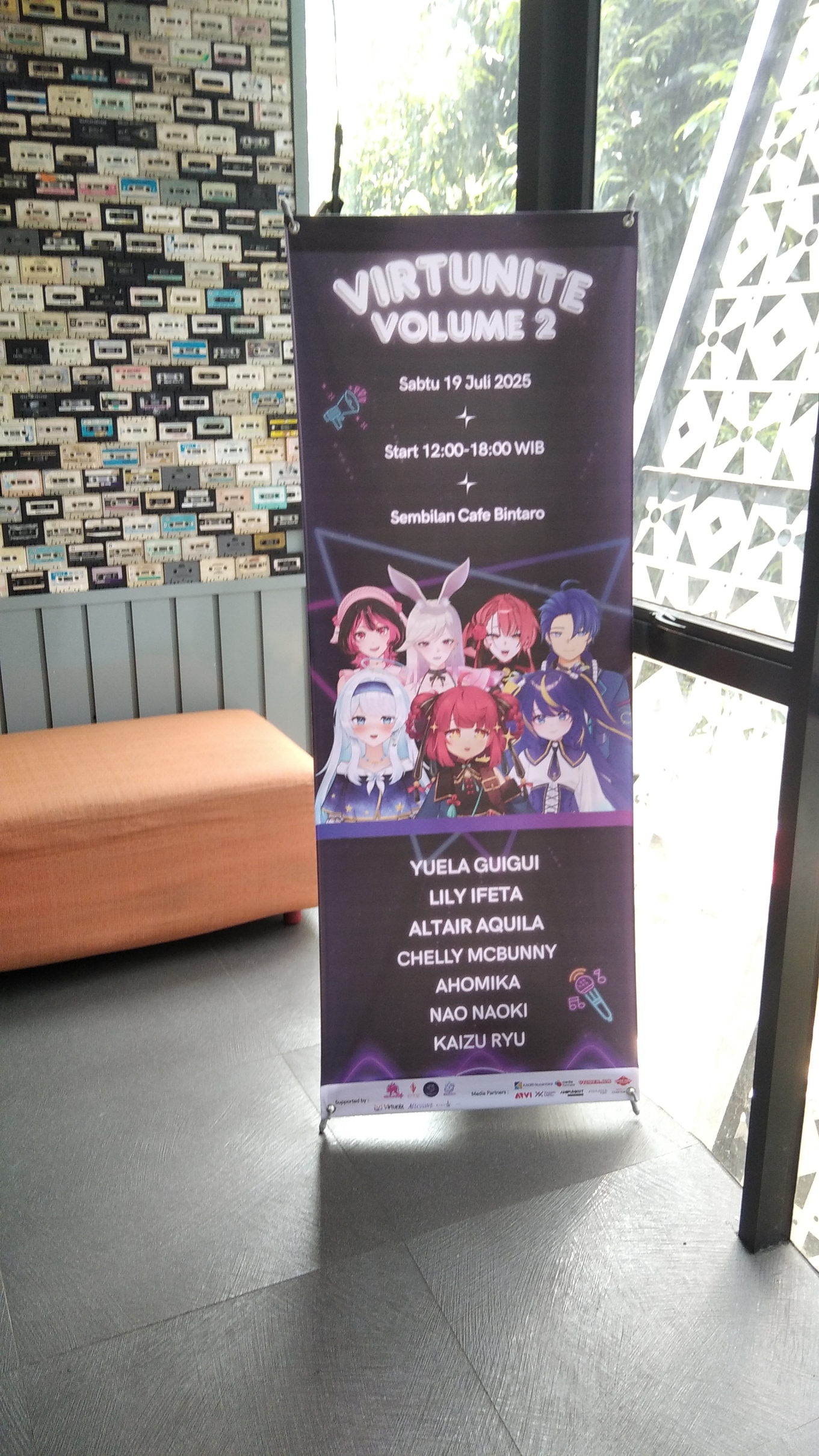 VTuber community-based event organizer, Virtunite Indonesia, has held an offline event where VTuber fans gather to enjoy karaoke and free talk sessions with VTubers with other visitors, titled Virtunite Vol 2, at Sembilan Cafe Bintaro, South Jakarta, on Saturday, 19 July 2025. Previously, Virtunite Indonesia has held the Virtunite Vol. 1 event on 12 April 2025 at Kopi Kodam Tebet with Chrysaora Hali, Rainonly, Shiina Asherah, and DJ Anoku.