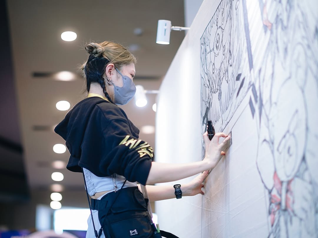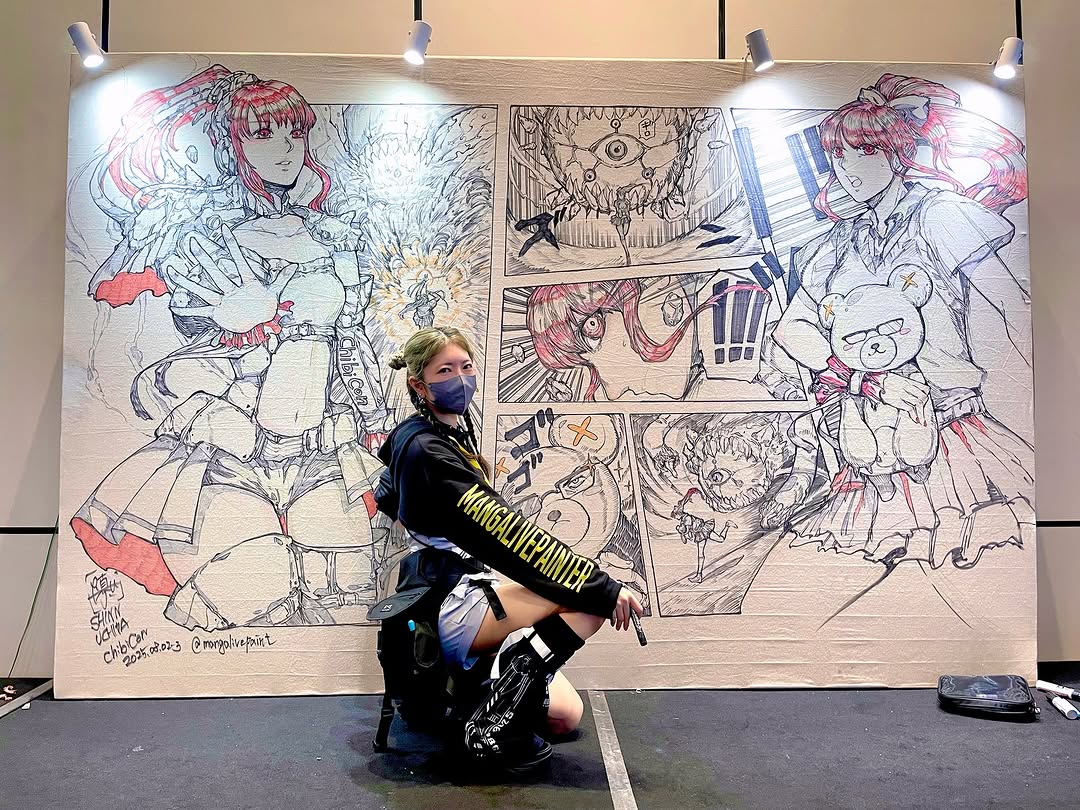 KN: Please correct me if I’m wrong, but I believe your debut as a manga live painter happened quite instantaneously at Design Festa. You hadn’t done large-scale wall manga before that. What inspired you to take that leap into manga live painting, especially since it’s such a rare and unique path?