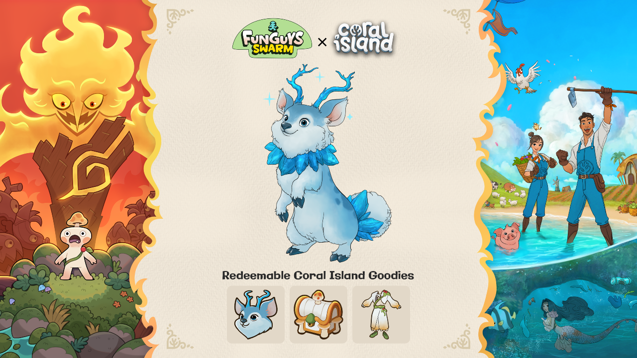 To celebrate the game’s release, Stairway Games has also confirmed a crossover with their previous game, Coral Island. In this crossover, Stairway Games offers exclusive rewards for those who purchase Funguys Swarm, including the Fungarian Outfit, Fungarian Chest and Crafting Recipe, and the Mythical Pet Outfit: Rusdy. All of them can be redeemed in Coral Island.
