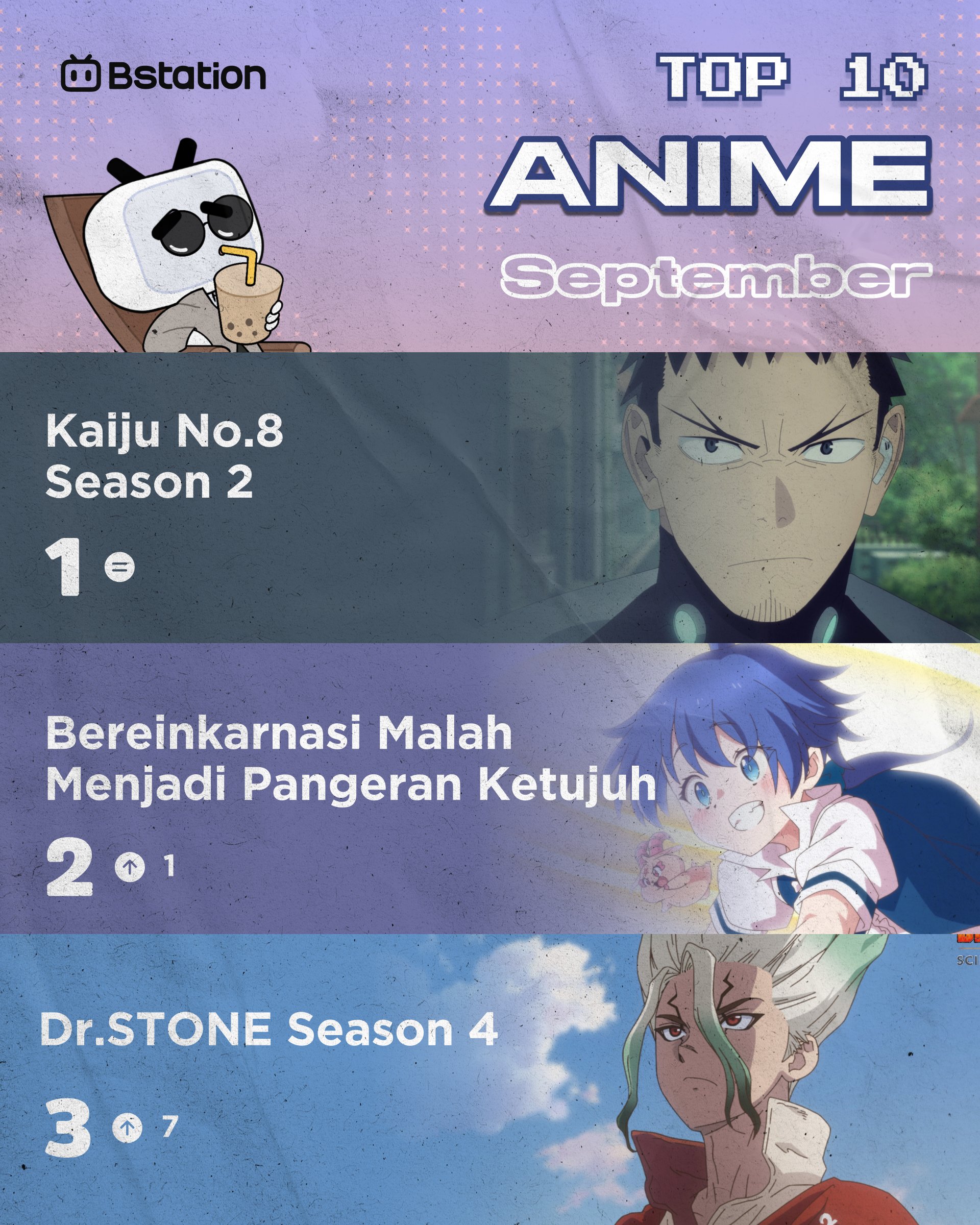 On their social media, BStation has announced the most-watched anime on their platform in September 2025. Kaiju No.8 takes the top spot, followed by I Was Reincarnated as the 7th Prince so I Can Take My Time Perfecting My Magical Ability (Indonesian title: Bereinkarnasi Malah Menjadi Pangeran Ketujuh) and Dr.Stone.