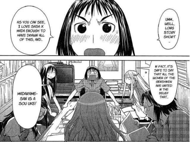 To give a clearer example, here is an excerpt of a conversation that Galbraith observed from a group of fujoshi after they visited a dōjin market event.