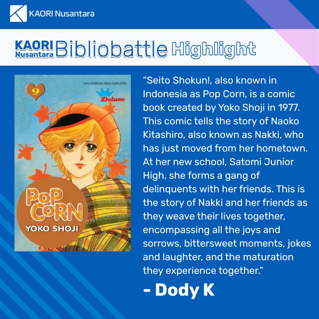 “Seito Shokun!, also known in Indonesia as Pop Corn, is a comic book created by Yoko Shoji in 1977. This comic tells the story of Naoko Kitashiro, also known as Nakki, who has just moved from her hometown. At her new school, Satomi Junior High, she forms a gang of delinquents with her friends. This is the story of Nakki and her friends as they weave their lives together, encompassing all the joys and sorrows, bittersweet moments, jokes and laughter, and the maturation they experience together.