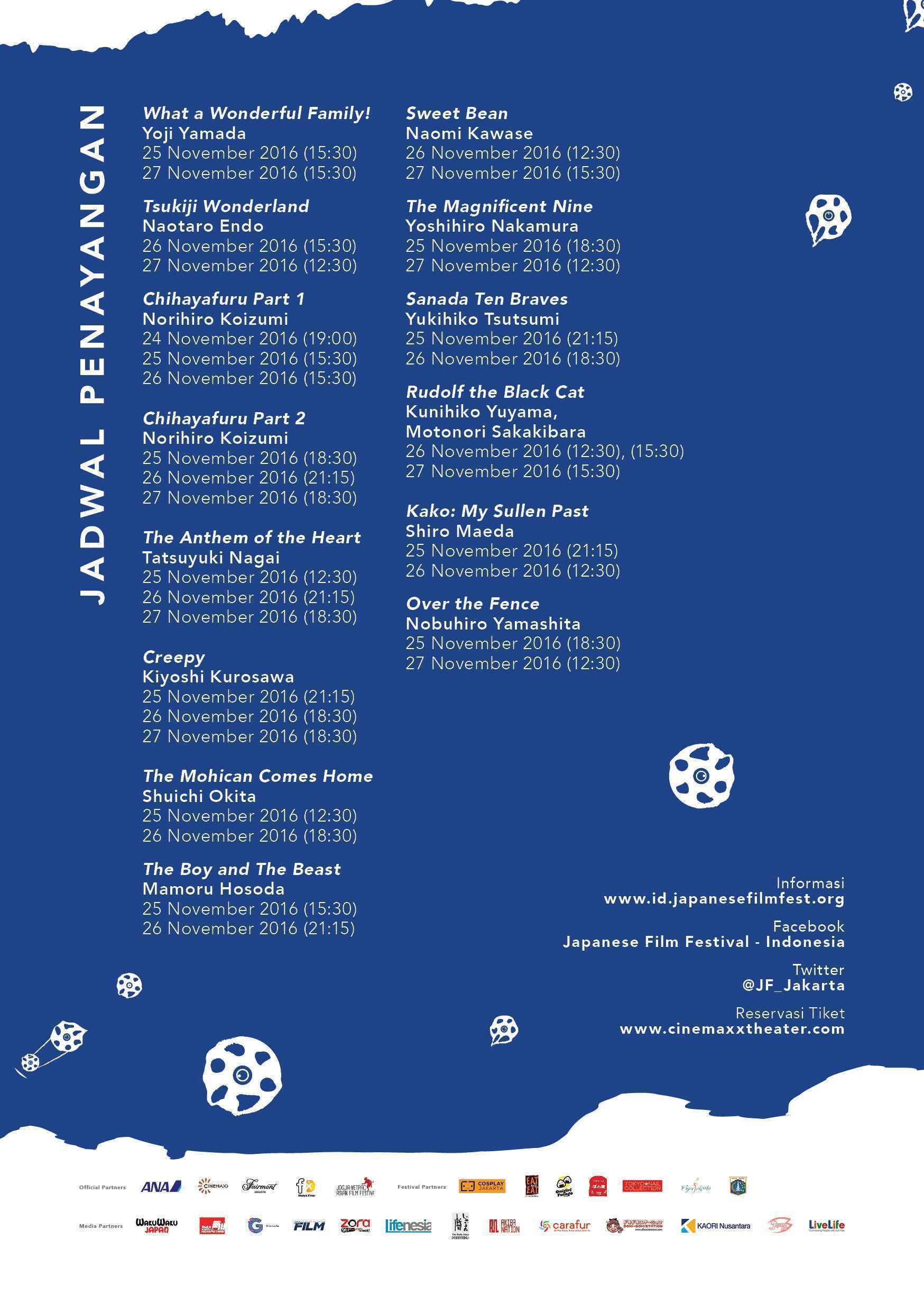 Japanese Film Festival (JFF) is back! JFF is a Japanese movie platform designed to increase awareness towards Japanese movies and gathering fans across Southeast Asia. JFF Indonesia was first held in 2015 by the Agency of Cultural Affairs in collaboration with the Japanese Embassy in Indonesia, Japan Foundation, and Japan Image Council. This year, JFF Indonesia will be a part of JFF Asia Pacific Gateway, initiated by Japan Foundation and held throughout 10 countries across Southeast Asia and Australia. 14 latest Japanese movies from 2015 to 2016 in various genres has been prepareed to fill JFF Indonesia. JFF is expected to become a bridge between Japanese movies and its fans by offering various activities related to Japanese culture in general and movies in specific.