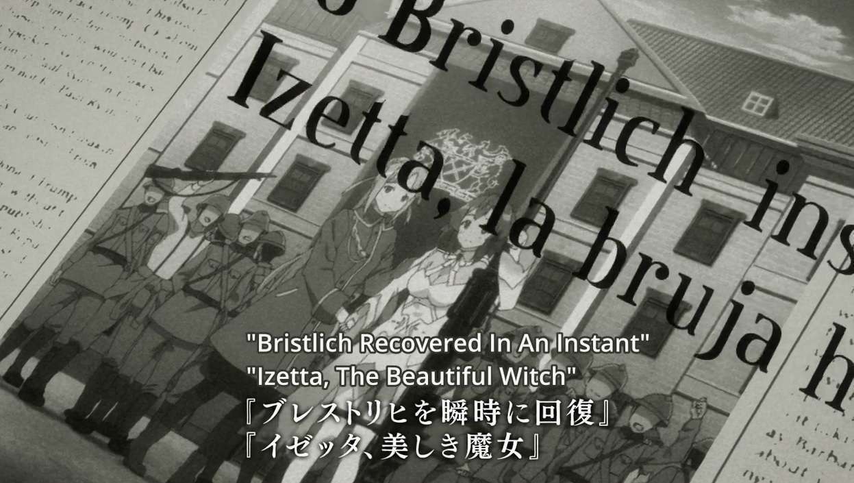 That is not to say the actual battles become unimportant. Izetta still conducts actual assaults against Germanian positions. But the anime shows how these, along with the rest of her appearances, are staged and framed to produce appealing contents for the media, to the point where a battle that was won through an ordinary scorched earth tactics need to be staged and framed as Izetta’s doing too. And the media, provided with something unusual about the war, enthusiastically reproduced those contents (getting caught in the frenzy of excitement, some even embellish the contents on their own). Izetta may be able to lift and hurl tanks with her magic, but beyond that, the bewitchment of the minds of the masses through media contents is really, the most sophisticated sorcery in the war.