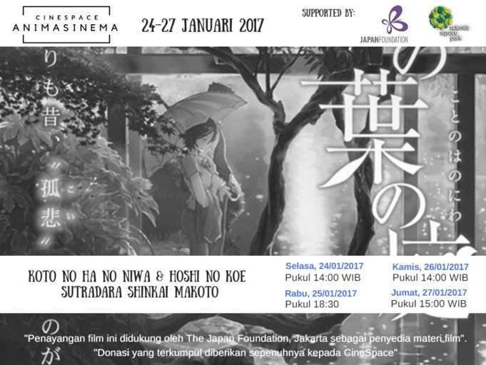 This screening will be charged donation of Rp 15.000, including coffee or tea as beverages. This film screening is supported by The Japan Foundation Jakarta as the film material provider. All the received donation will be given to CineSpace. Here are the schedule for the film screening of Koto no Ha no Niwa and Hoshi no Koe at CineSpace: