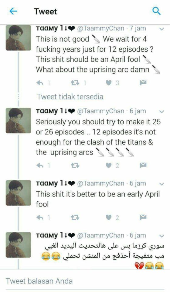 Theb in the following day, the Twitter account of Attack on Titan posted about an “apology” from the production committee, which was to be published in Japanese newspaper, that many thought to be an apology for the shorter second season. The funny thing is, the “apology” was a part of April Fools joke and also serve as an ad for Attack on Titan. @CanipaEffect explains that the content of the ad was “we deeply apologize for aspiring to make a high-quality product”. The Apology was for the show being so good, you’ll become so obsessed that you’ll forget about your work, studies and family.