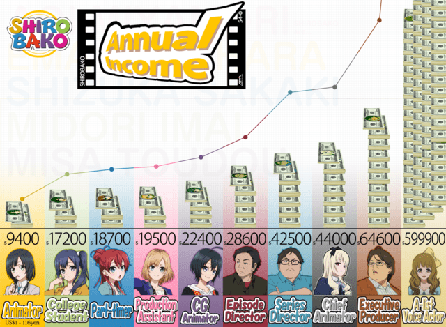 The diagram above shows that a part-timer and a college student have more money than a novice animator. There are less and less people interested with this career because the value of their work are not equal to their blood, sweat and tears. This situation might a bit different with Kyoto Animation and Production I.G animators, though.
