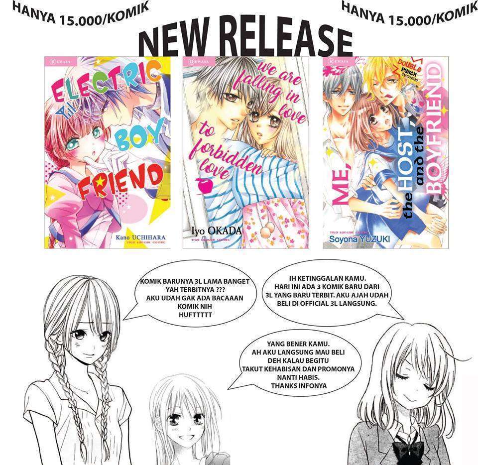 Publisher Tiga Lancar Comics has recently published three one-shot manga at the same time on Tuesday (30/5). The three titles are Soyona Yuzuki’s Me, the Host and the Boyfriend, Kano Uchihara’s Electric Boyfriend, and Iyo Okada’s And Yet We Are Falling in Love to Forbidden Love.