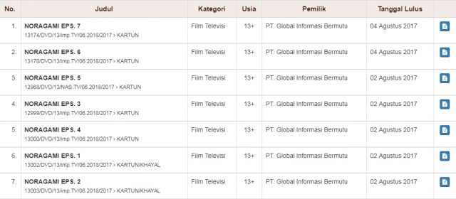 Indonesian TV channel, Global TV has registered Noragami to Lembaga Sensor Film (Film Censorship Board of Indonesia). Feature films and TV programs that are meant for distribution in Indonesia are required to be approved first by the Censorship Board, and the Board may request for parts that are considered inappropriate to be censored or cut.