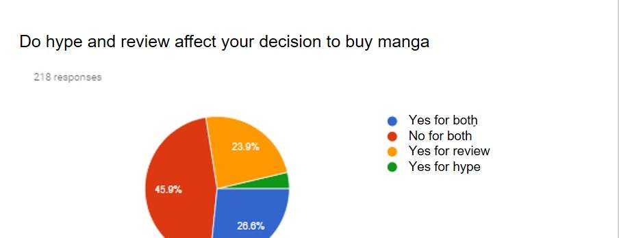 Based on the survey, almost half (45.9%) of the respondents are not affected by review or hype in deciding to buy a manga series. Between review and hype, though, review has more influence than hype with 23.9% of respondents say review influenced their decision to buy manga, and 26.6% cite being influenced by both, while only 3.6% say they are influenced by hype only.