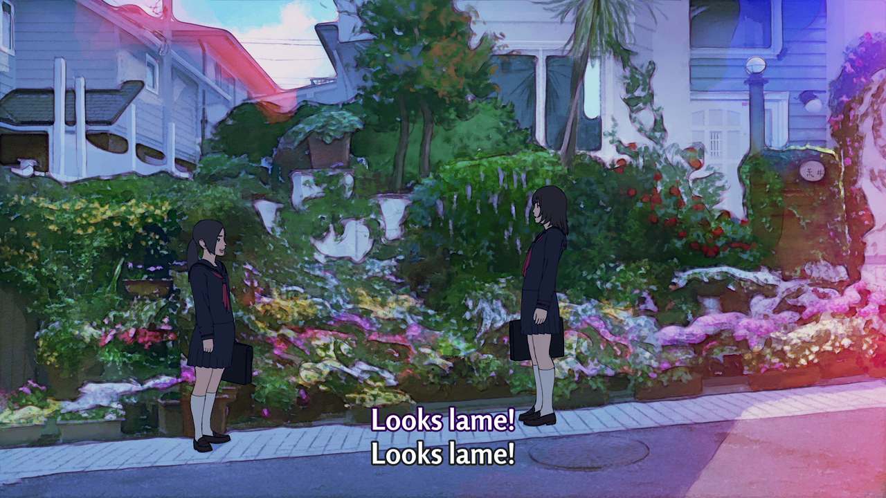 The rotoscoping technique also lets the director, Shunji Iwai, experimenting with his movie. As a director, Iwai is more familiar with live action. Rotoscoping allows him to do some experiment when recording in live action, then trace it to animation to make the movement more realistic. The slow motion parts, for example, looks like they were recorded with high speed camera before slowing it down in editing process.
