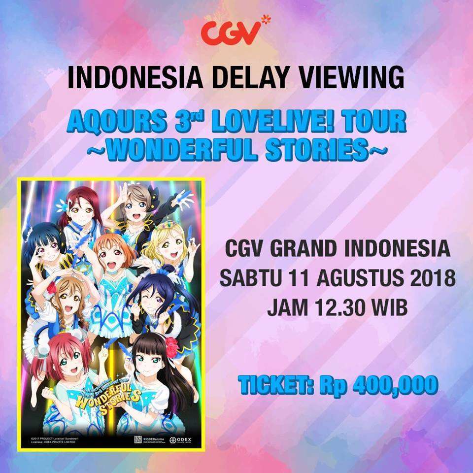 On Wednesday (8/8), the Facebook page of CGV Cinemas Indonesia announced that a delayed viewing of Aqours 3rd Love Live! Tour: Wonderful Stories will be shown on 11 August 2018 at CGV Grand Indonesia theater in Central Jakarta. The viewing is charged Rp 400,000.00 (US$ 27.78) per ticket. The tickets are available for purchase through CGV Cinemas’ website: https://bit.ly/Aquors