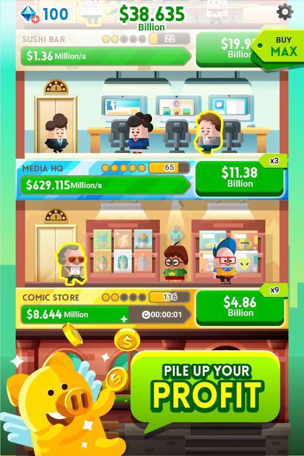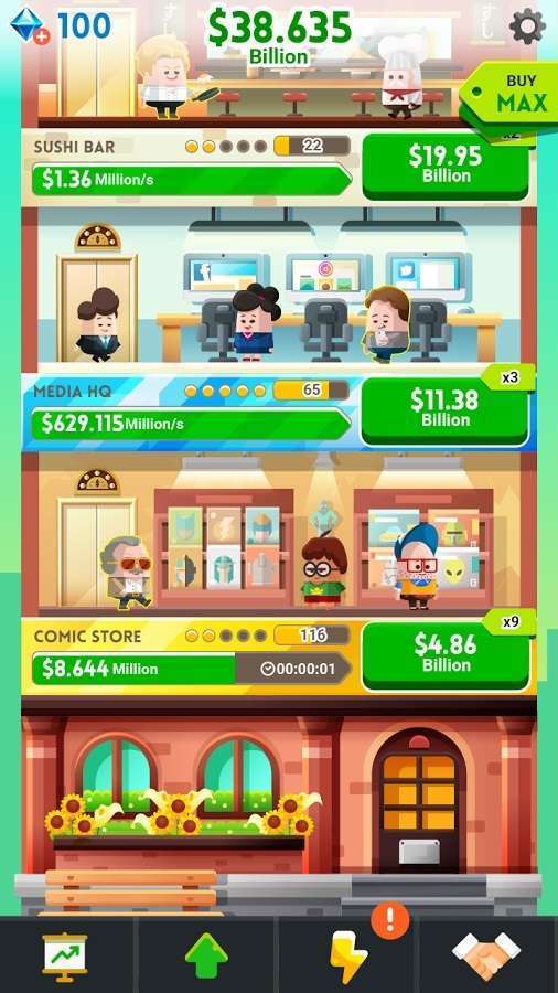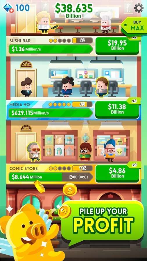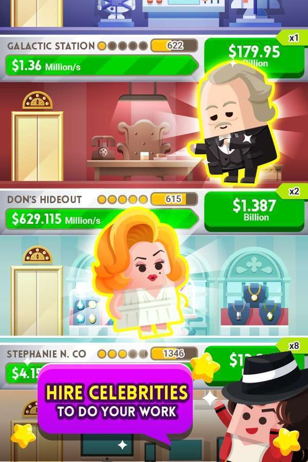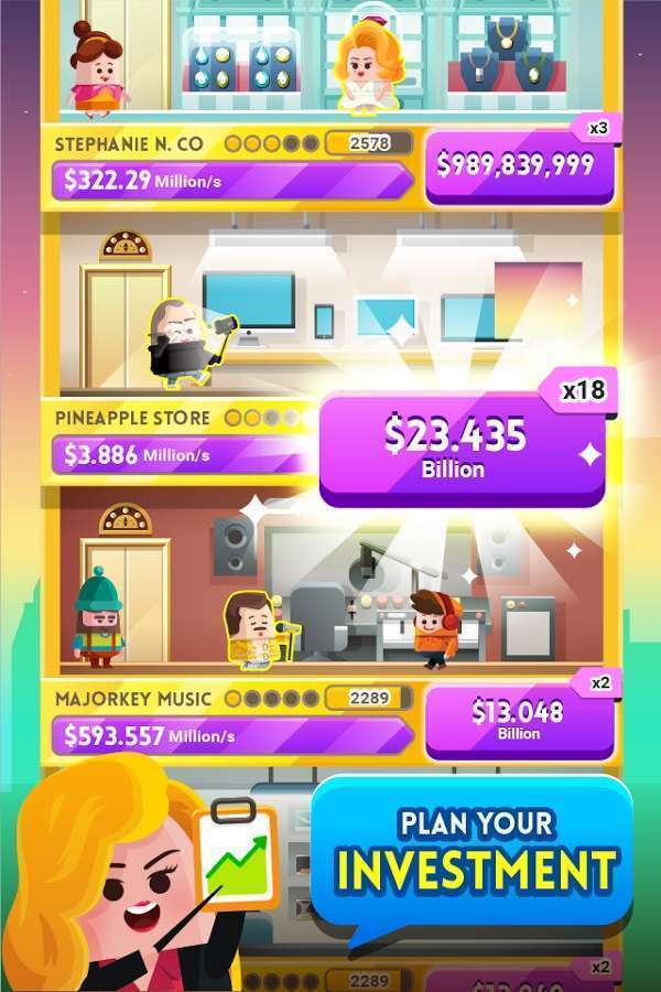 Dalam game clicker ini, pemain akan ditantang untuk membangun, mengembangkan dan memperluas kerajaan bisnisnya. Selama permainan, pemain akan ditantang untuk terus melakukan tap, tap, dan tap untuk terus mendapatkan uang, dan melakukan ekspansi bisnis seperti mengatur perputaran uang, memperbesar perusahaan miliknya, membeli perusahaan baru, hingga membangun relasi dengan kalangan elit untuk melanggengkan bisnisnya.
