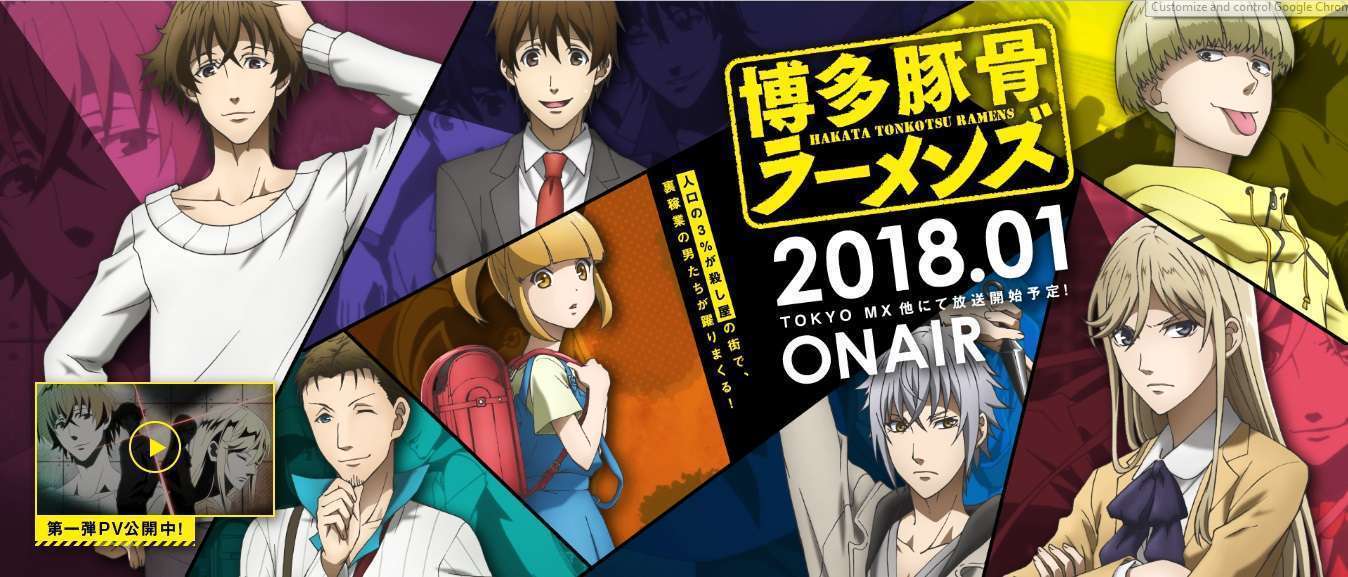 Sebagaimana telah diberitakan sebelumnya, Hakata Tonkotsu Ramens (Hakata Pork Bones Ramens), novel karya Chiaki Kisaki dengan ilustrasi oleh Hako Ichiiro ini akan diadaptasi menjadi anime. Kini diumumkanlah bahwa anime ini akan dirilis di Jepang pada 12 Januari tahun 2018 mendatang, melalui saluran Tokyo MX, BS11, dan AT-X.