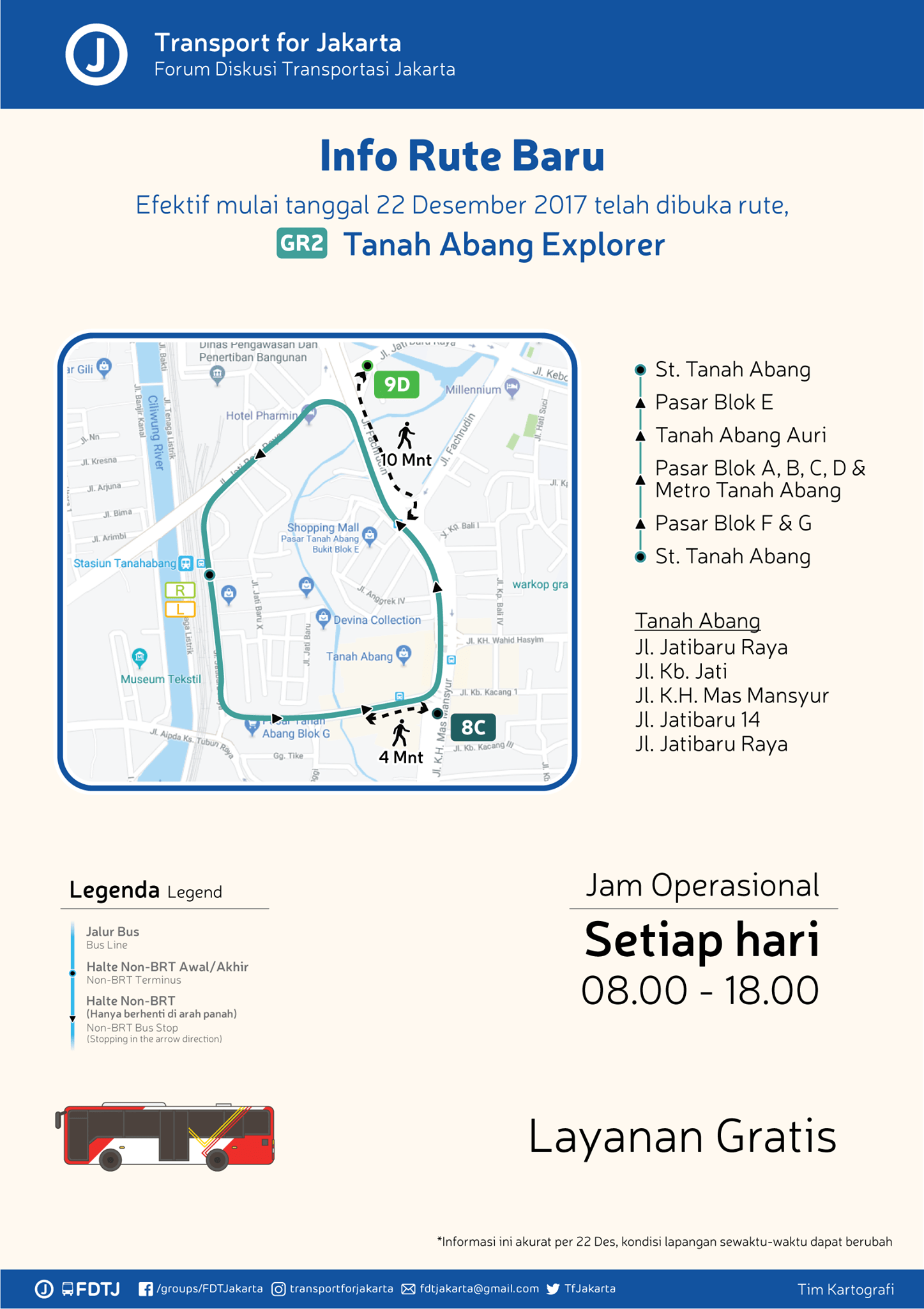Penataan wilayah di Tanah Abang yang dicanangkan oleh Pemprov DKI Jakarta tak terlepas dari dilakukannya rekayasa lalu lintas. Untuk mengatasi hal tersebut, Transjakarta menyiapkan bus gratis dengan nama ‘Tanah Abang Explorer’. Bus gratis dengan kode rute GR2 ini dapat digunakan masyarakat yang hendak berkeliling area perbelanjaan Tanah Abang.