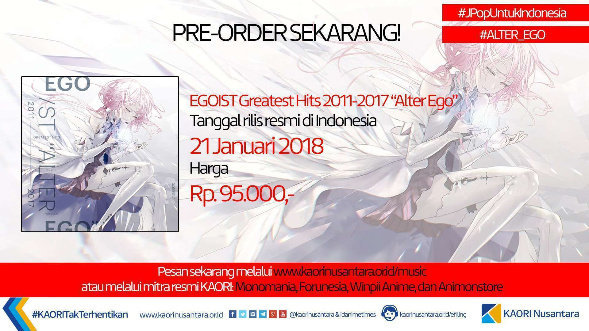 Kabar gembira untuk para fans EGOIST! KAORI Nusantara merilis album kompilasi terbaik EGOIST bertajuk “GREATEST HITS 2011-2017 ALTER EGO” secara resmi di Indonesia. Tanggal rilis resmi album ini serentak di Indonesia adalah 21 Januari 2018 mendatang. Harga resminya pun juga tergolong sangat ramah untuk kantong, yaitu Rp. 95.000,- saja. Kamu juga berkesempatan mendapatkan 1 buah bonus merchandise resmi dari EGOIST jika membelinya. Album EGOIST rilisan resmi Indonesia ini bisa dipesan mulai dari sekarang melalui pre-order di KAORI Music.
