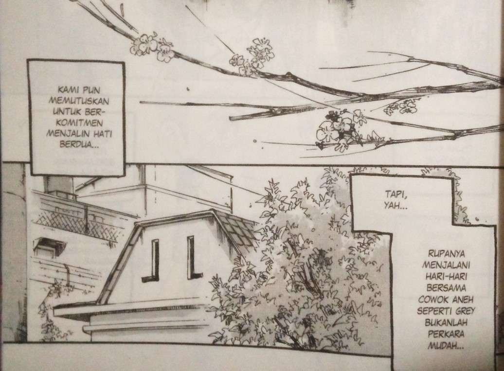 Sementara Grey dapat kerjaan ngegitar, Jingga kebagian peran sebagai oneesan untuk menemani dek Nila. Terang saja Jingga kesal karena ditinggal Grey dalam mengurus Nila, tapi ada hikmah di balik keadaan itu. Penggunaan komposisi dan layout panel oleh Sweta begitu puitis dalam menggambarkan berlangsungnya waktu secara kontemplatif, dan dalam menggambarkan kegamangan dan renungan karakternya.