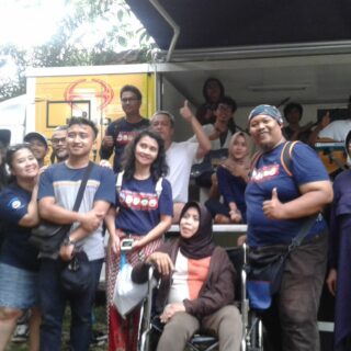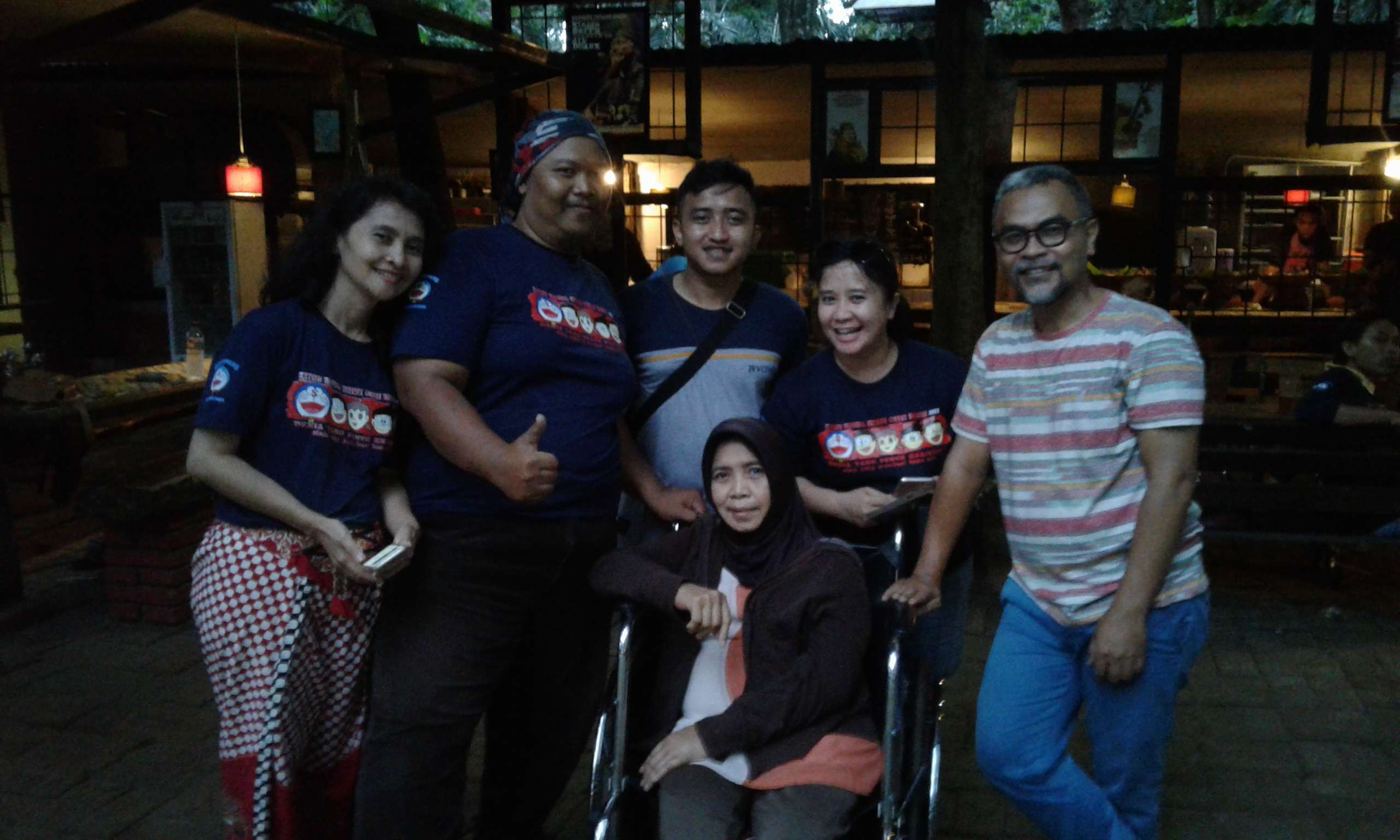 Para seiyuu Doraemon dari kiri ke kanan: Jessy Milianty, Bima Sakti, Dana, Dewi Sartika, Santosa Amin, dan Nurhasanah (berkursi roda)