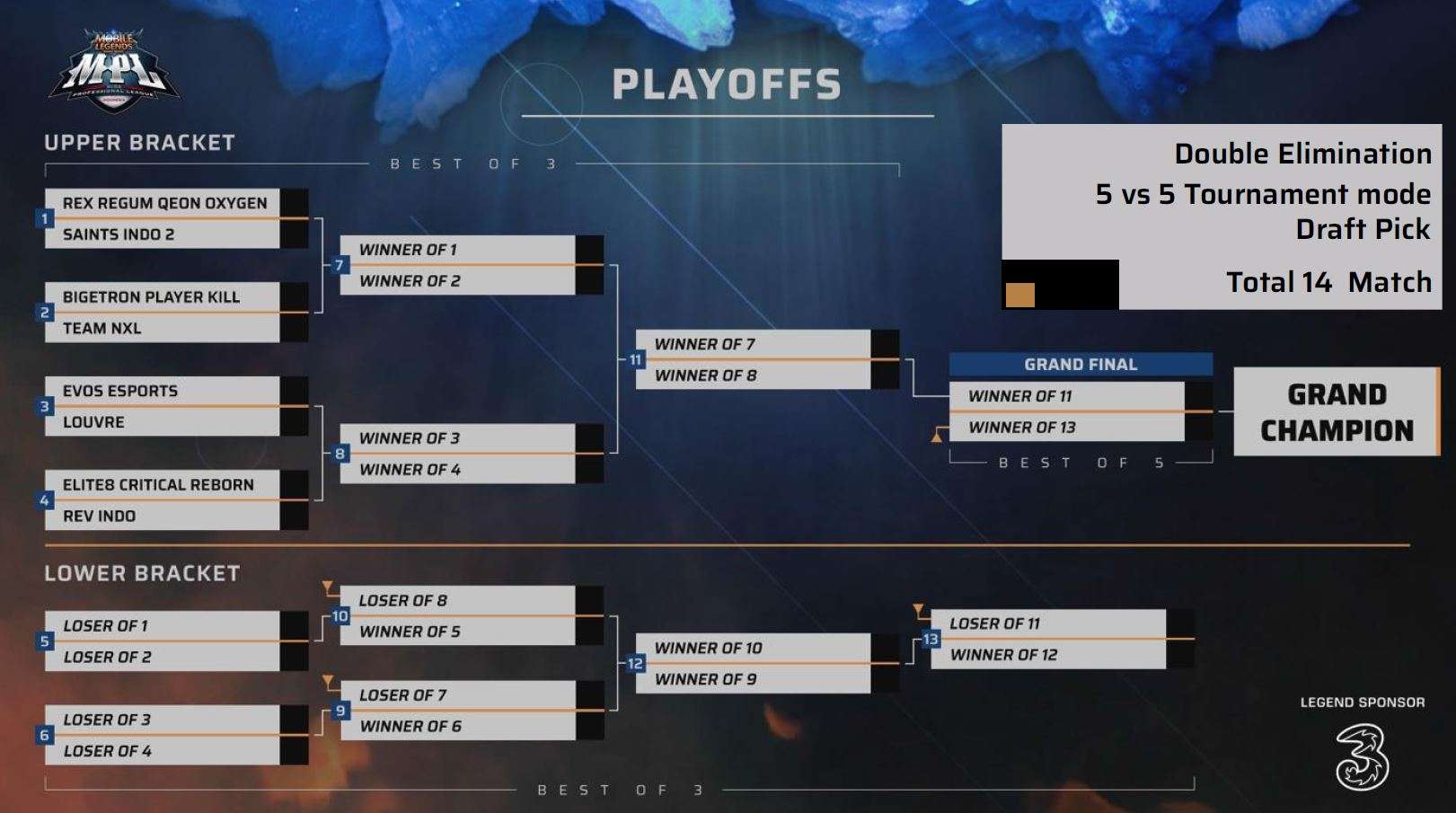 8 tim ini nantinya akan berlaga di babak Playoff yang menggunakan sistem Double Elimination. Untuk penjadwalan pertandingan, hal ini ditentukan oleh hasil akhir dari Regular Season.
