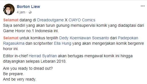 Melalui akun Facebooknya, Borton Liew, CEO dari CIAYO Corp yang menaungi laman komik digital lokal CIAYO Comics menyebutkan bahwa DreadOut, game survival horor karya pengembang game asal Bandung, Digital Happiness akan segera diadaptasi menjadi komik yang akan dimuat di CIAYO Comics. Rencananya komik tersebut akan dirilis mulai Lebaran 2018.