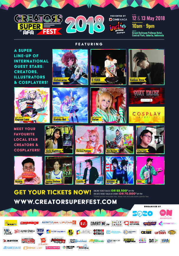 Setelah sukses menggaet lebih dari 10.000 pengunjung pada tahun 2017 lalu, salah satu event tahunan untuk industri kreatif dalam negeri dan pop culture, Creators Super Fest 2018 kembali diadakan. Pada tahun ini, acara tersebut akan berlokasi di Grand Ballroom Pullman, Central Park, Jakarta.