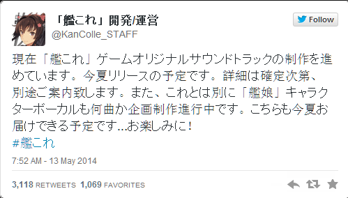 Melalui akun twitter resmi nya, @Kancolle_STAFF mengumumkan bahwa Kancolle Original Sound Track saat ini sedang dalam produksi dan direncanakan akan dirilis musim panas ini. Info lebih lengkap akan dirilis sebentar lagi. Selain itu, ada rencana untuk membuat Character Song untuk beberapa karakter, yang juga akan dirilis musim panas ini.