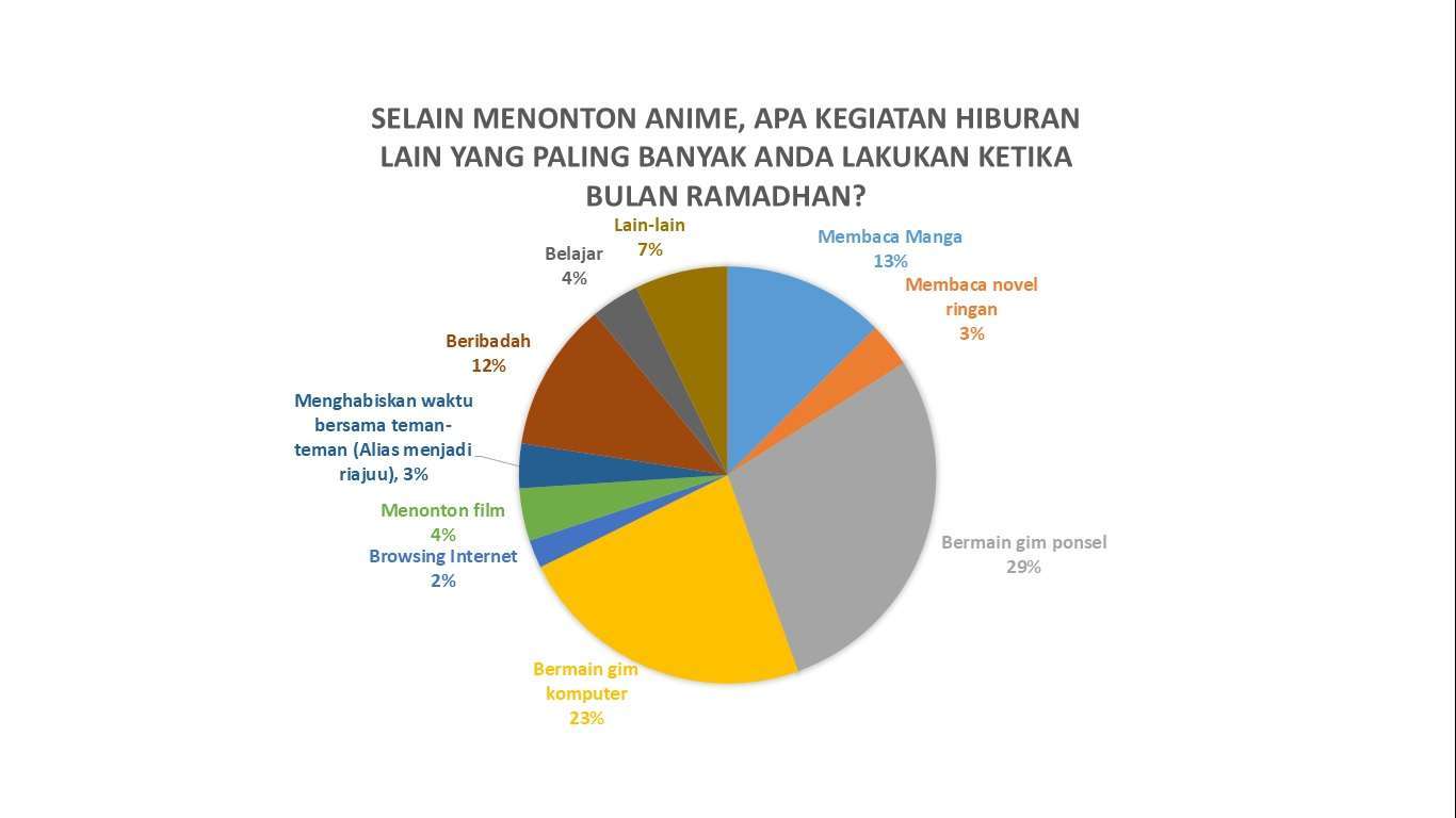 Yang sedikit mengejutkan adalah sebanyak 12% responden atau 37 orang memilih untuk melakukan ibadah. Ibadah menjadi kegiatan ‘hiburan’ yang difavoritkan mengingat di Bulan Puasa ada kecenderungan untuk meningkatkan kegiatan ibadah dibanding bulan-bulan lainnya, entah itu karena lingkungan yang memaksa ataukah memang sudah menjadi tabiat beberapa orang. Penggemar anime yang gemar beribadah ini mungkin juga ada kaitannya dengan fenomena wibu syariah yang makin hari jumlahnya meningkat.