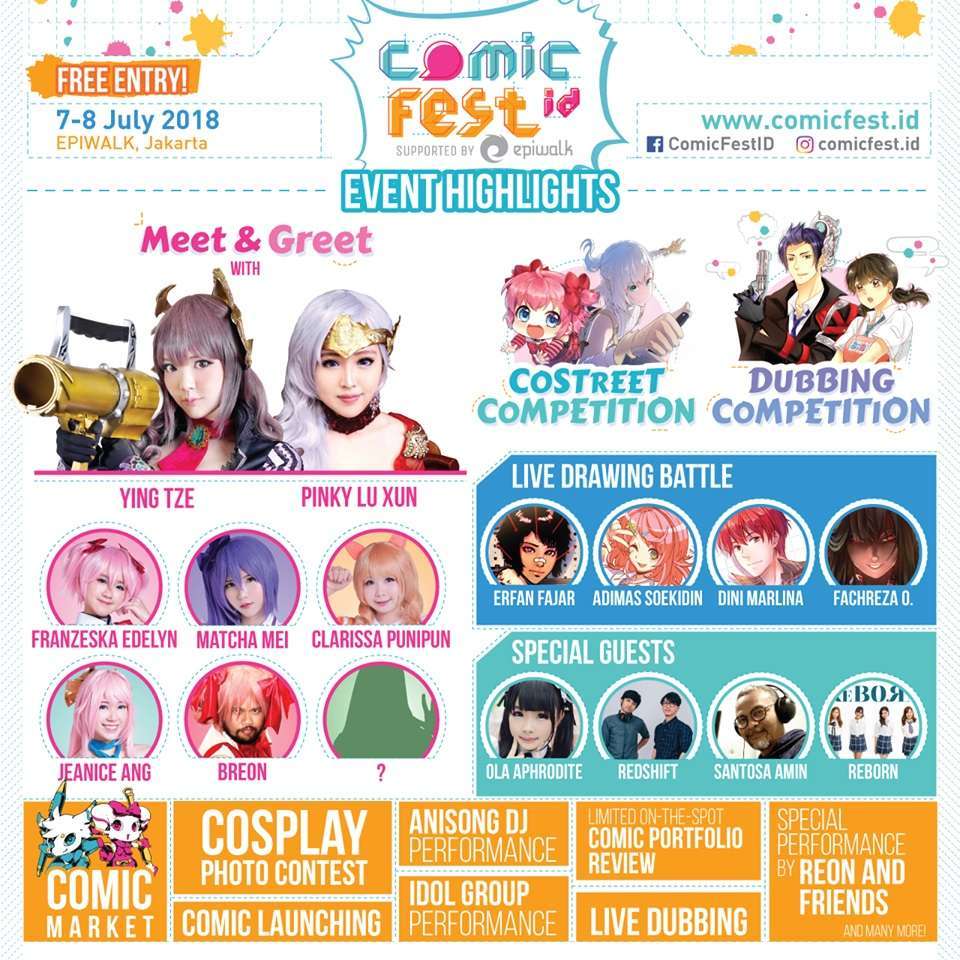Guest stars yang menarik ditambah dengan rangkaian acara yang seru, membuat acara Comicfest ID 2018 menjadi acara tahunan yang pastinya tidak boleh dilewatkan oleh para pelaku sekaligus penikmat komik dan cosplay Indonesia! Yuk ajak teman-teman kamu untuk datang ke Comicfest ID 2018!